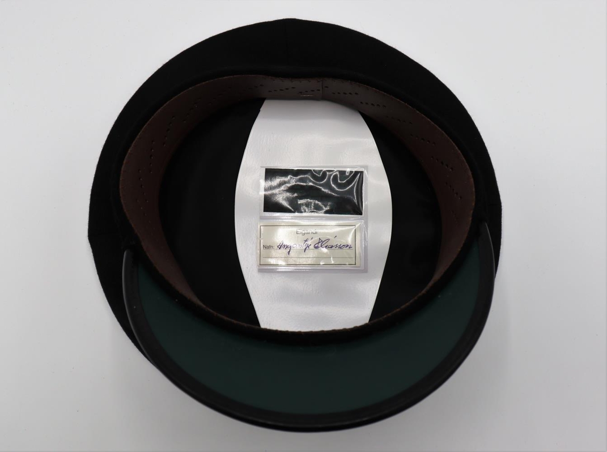 Kaskeiti með svörtum koll og svörtu glansandi deri, hvít hlíf fyrir kollinn fylgir með inn í húfunni. Gyllt rönd sem fer allan hringinn, gylltir hnappar, ca við gagnaugað, sitthvoru megin með akkeri á. Inn í hattinum er dökkbrúnn leðurbútur sem nær allan hringinn. Kaskeitið er merkt "Angantýr Elíasson" og er framleitt af P.Eyfeld.