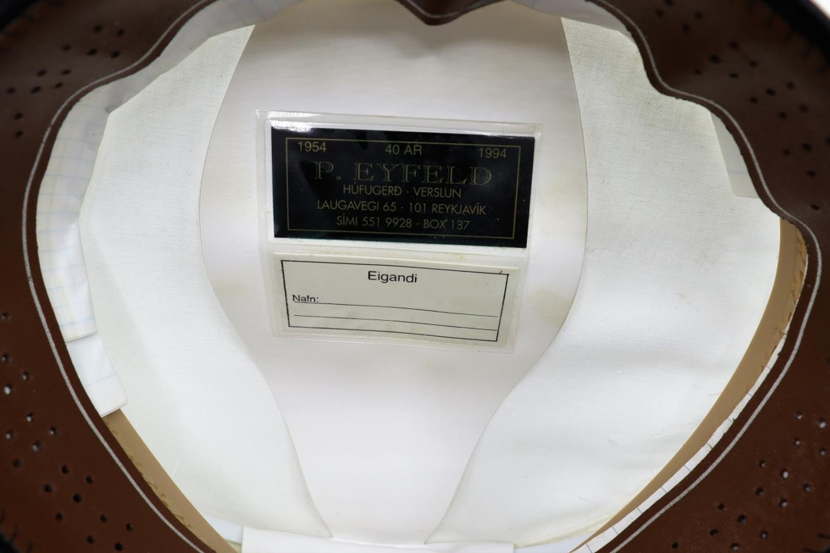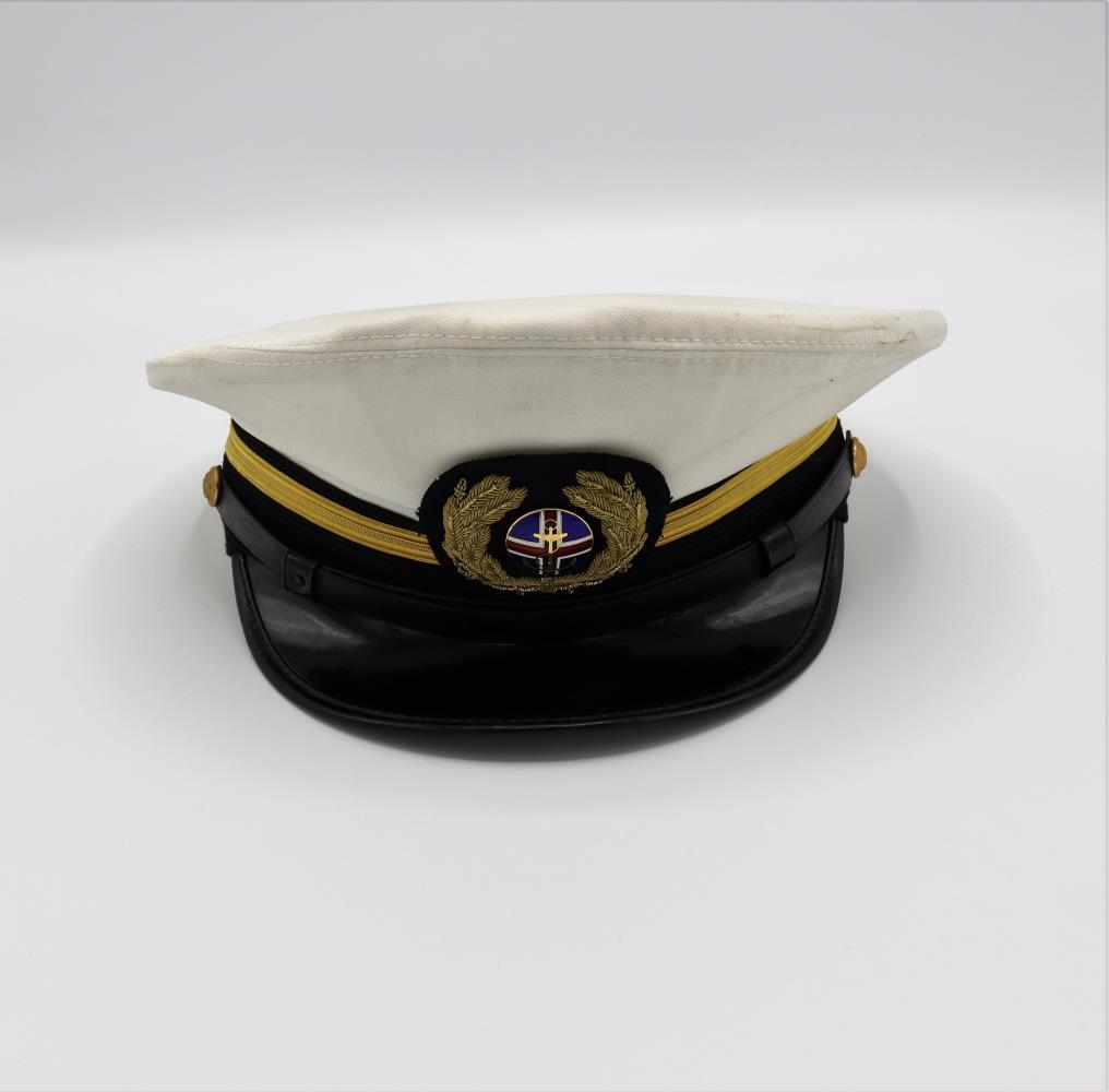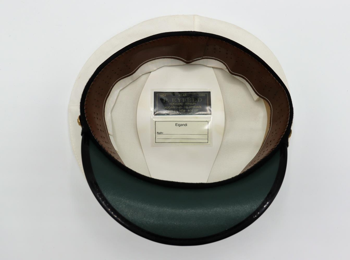 Kaskeiti með hvítum koll og svörtu glansandi deri. Merki á húfunni sýnir íslenska fánann með gyllt akkeri fyrir framan,-. Merkið er kringlótt og er umlukið 2 gylltum greinum á svörtum kringlóttum grunni. Undir grunninum er gyllt rönd sem fer allan hringinn á húfunni, gylltir hnappar með akkeri á hvorri hlið, að framan. Húfan er ómerkt en framleiðandinn er P.Eyfeld. inn í húfunni er ljósbrúnt leður, bakvið það eru brotin blöð, líklega til að þrengja húfuna.