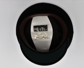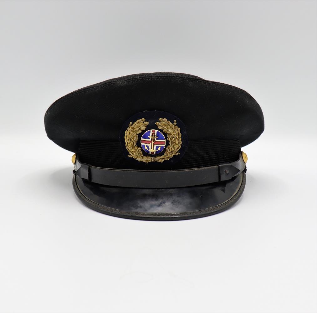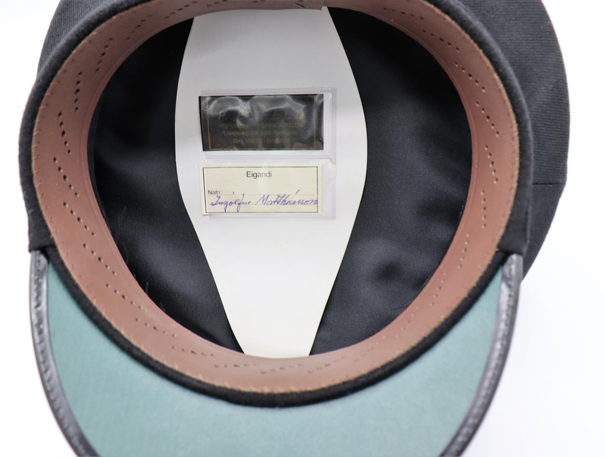 Kaskeiti með svörtum koll og svörtu glansandi deri. Merki á húfunni sýnir íslenska fánann með gyllt akkeri fyrir framan. Merkið er kringlótt og er umlukið 2 gylltum greinum á svörtum kringlóttum grunni. Gylltir hnappar með akkeri á hvorri hlið, að framan (við gagnauga). Merkt að innan "Ingólfur Matthíasson" Framleitt af P.Eyfeld.