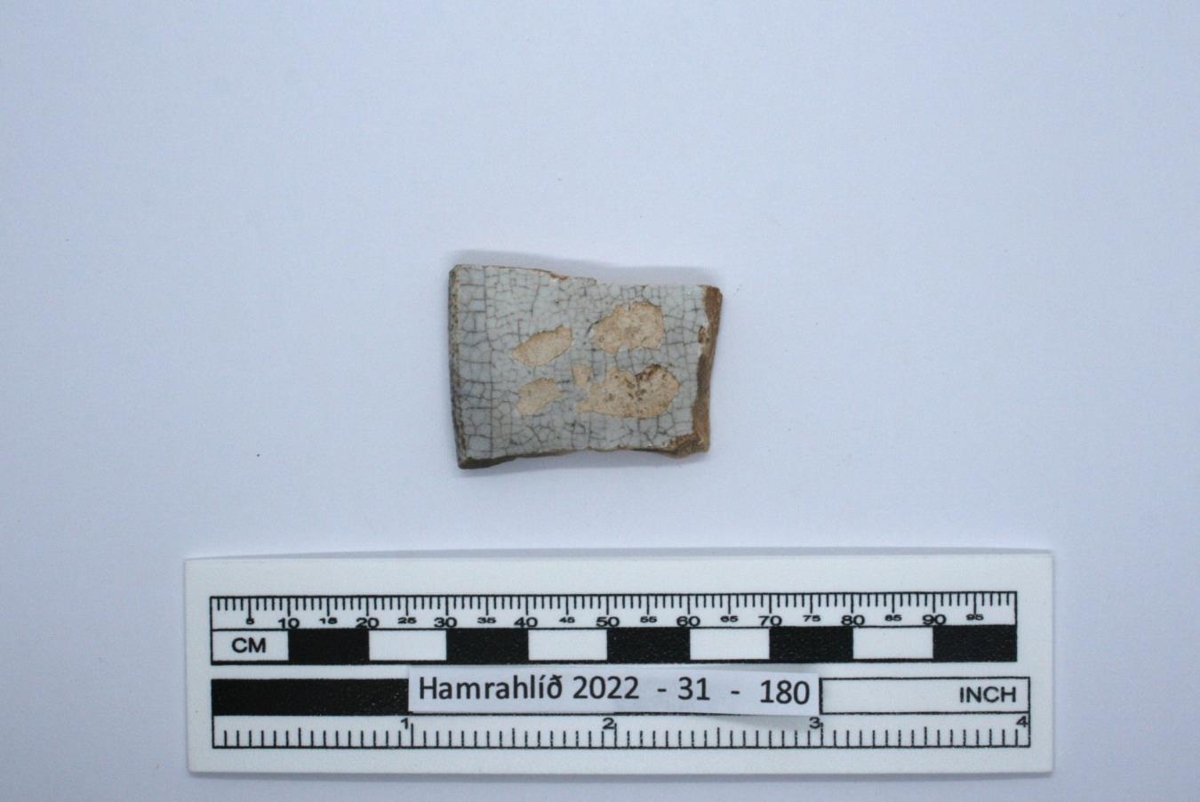Hvítleirsbrot sem er líklega úr diski. Á annari hlið brotsins er órætt fjólublátt skreyti.