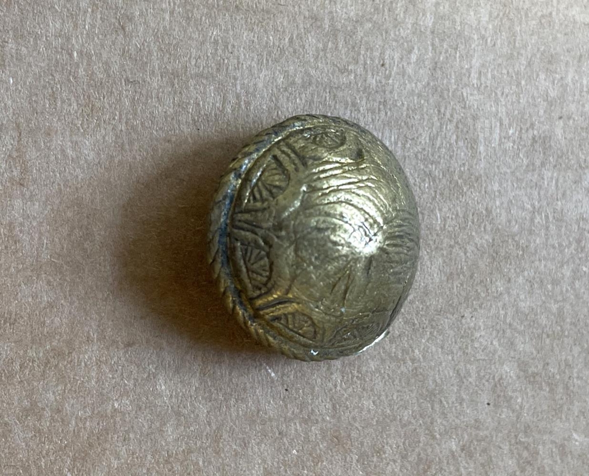 Kúluhnappur úr kopar, hálfkúla, grafinn og fornlegur. Fundinn í rústum Lundar í Fljótshverfi.