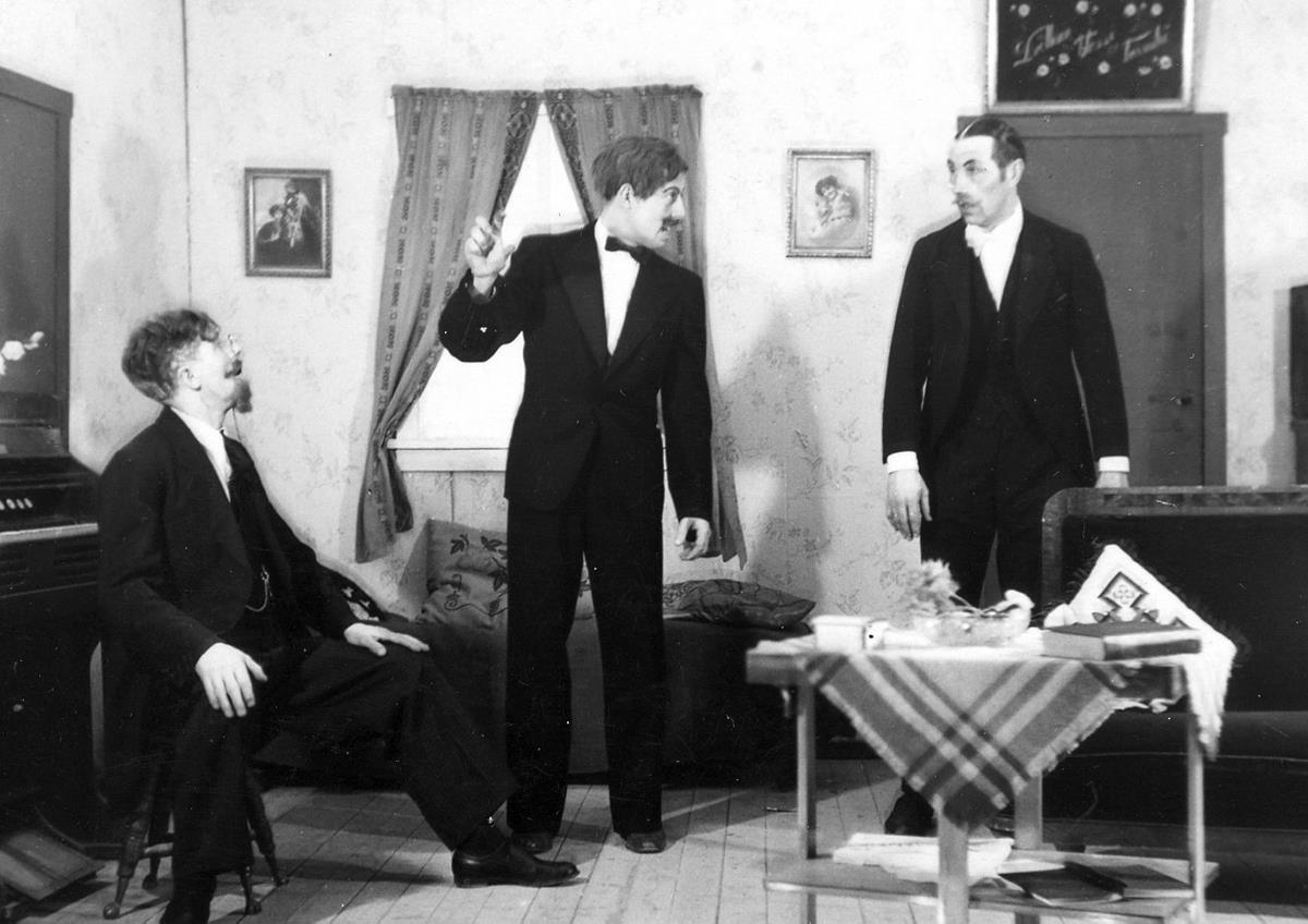 Hermann Eiríksson, Þórður Jónsson og Guðni Magnússon líklega í leikritinu „Karlinn í kassanum“ sem frumsýnt var í mars 1950.