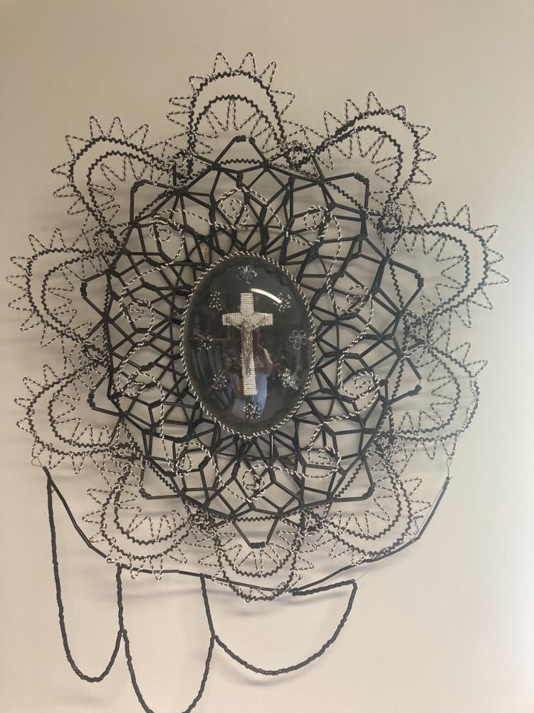 Líkkistukrans,stór, sporöskjulaga, útlendur, gerður úr vírvafningum og gleri. Í miðju róðukross undir gleri.