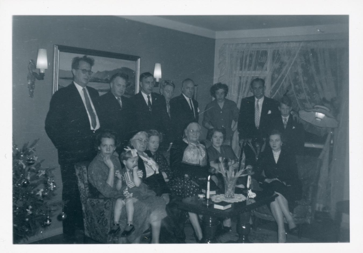 Fjölskylduboð á ónefndum stað, þekkja má Þórð Guðmundsson útgerðarmann frá Gerðum í Garði, standandi lengst til vinstri á myndinni og fyrir framan hann situr Ingibjörg Guðjónsdóttir eiginkona Þórðar.