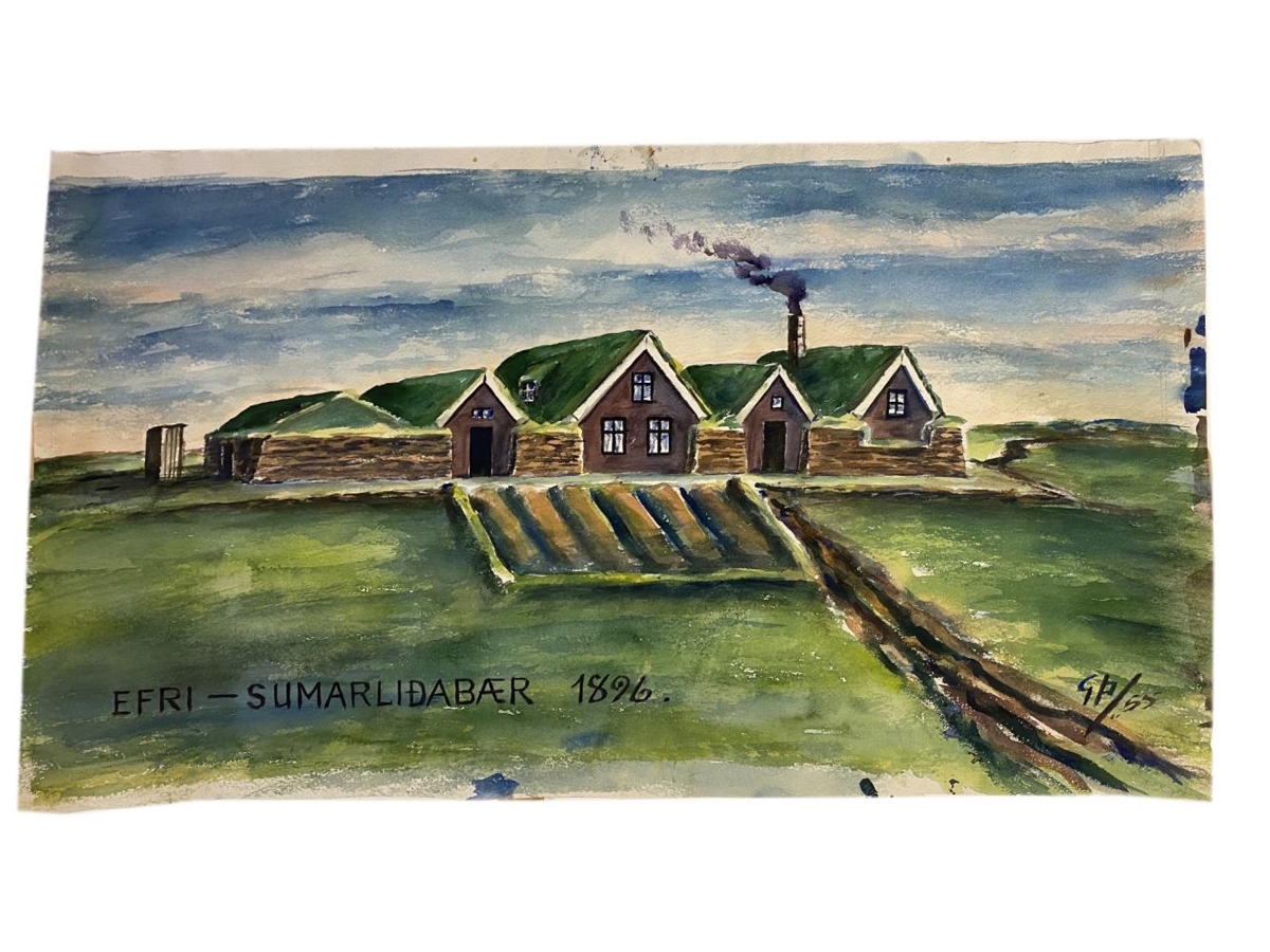 Vatnslitamynd af bænum Efri-Sumarliðabær. Á myndina er málað ártalið 1896 og upphafsstafirnir GÞ/55