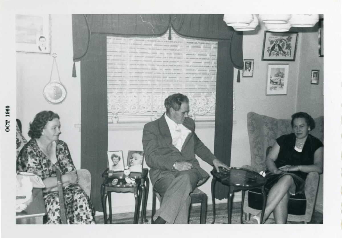 Hjónin Guðlaug Sveinsdóttir og Björn Guðjónsson frá Sunnuhvoli í Garði ásamt NN á góðri stund á heimili Lilju Vilhjálmsdóttur og Ársæls Sveinbjörnssonar á Sólvöllum í Garði (Garðbraut 15).