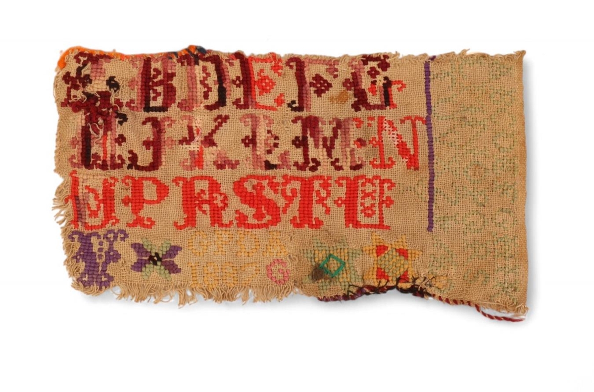 Bútur af stafaklút. Stafir saumaðir í með gamla íslenska krosssaumsporinu og krosssaumi með ullargarni í ýmsum litum. Ártalið 1887 er saumað í með gulum lit.