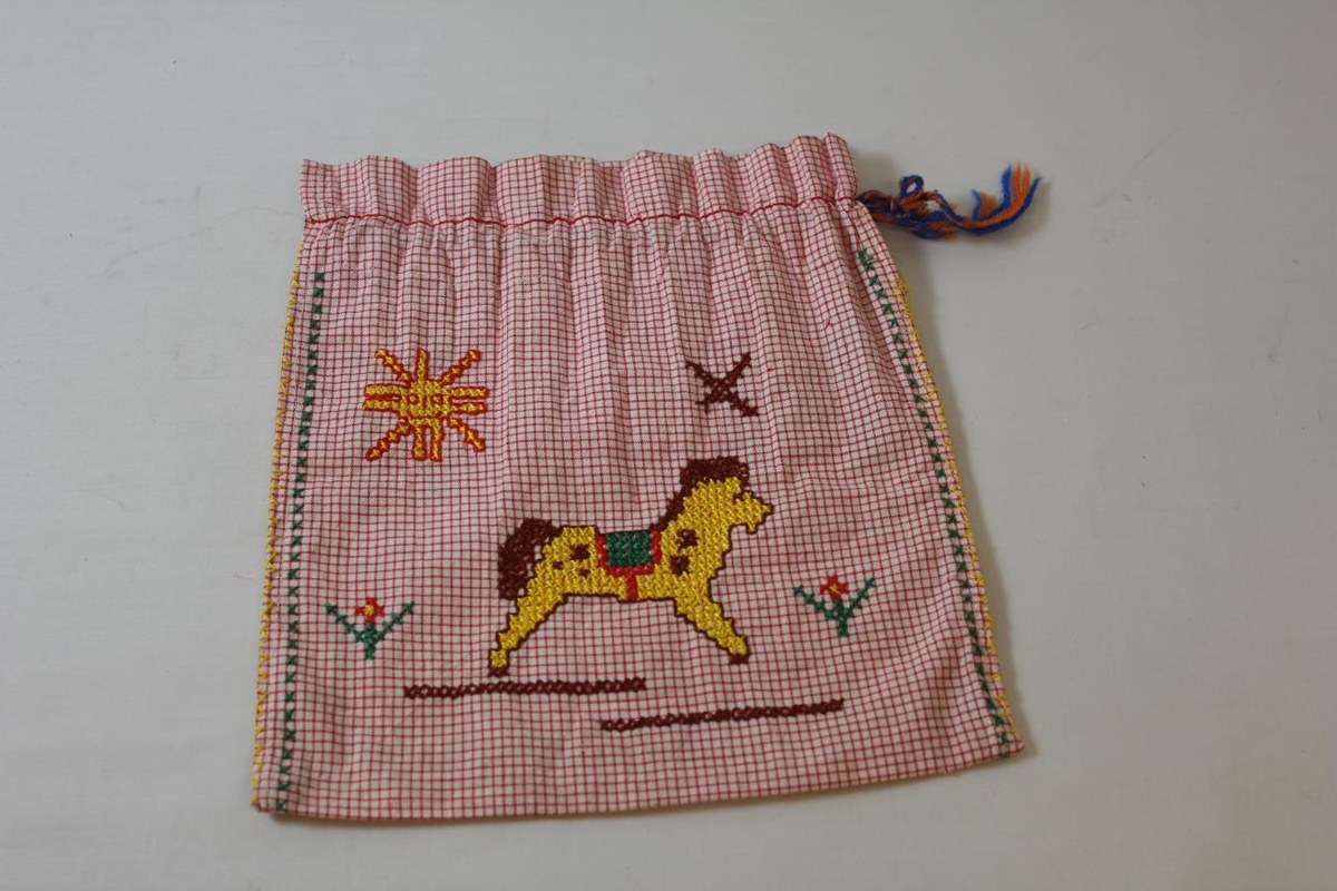 Skólahandavinna. Handavinnupoki.Rauð- og hvítköflóttur handavinnupoki. Merktur með krosssaumssporum: Margrét H 1974. Skólahandavinna gerð í Langholtsskóla.