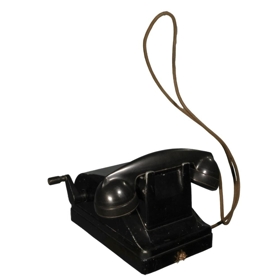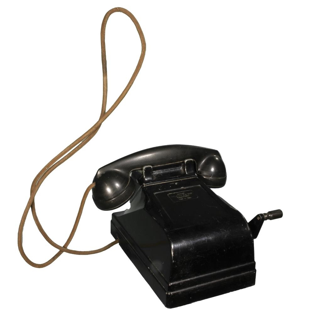 Svartur borðsími með handsveif á hliðinni.