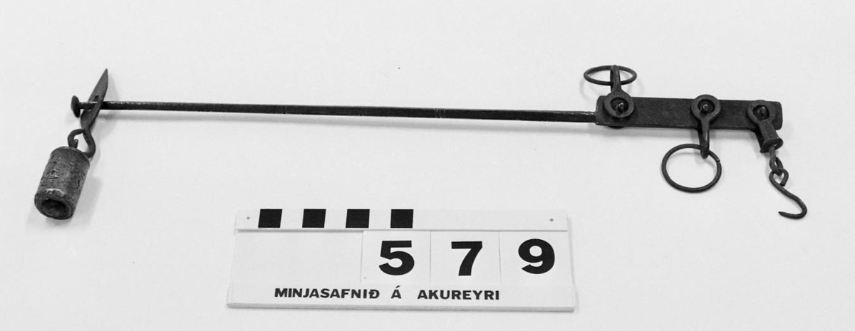 með messingklæddu blýlóði. Tveir hringir og krókur úr járni.