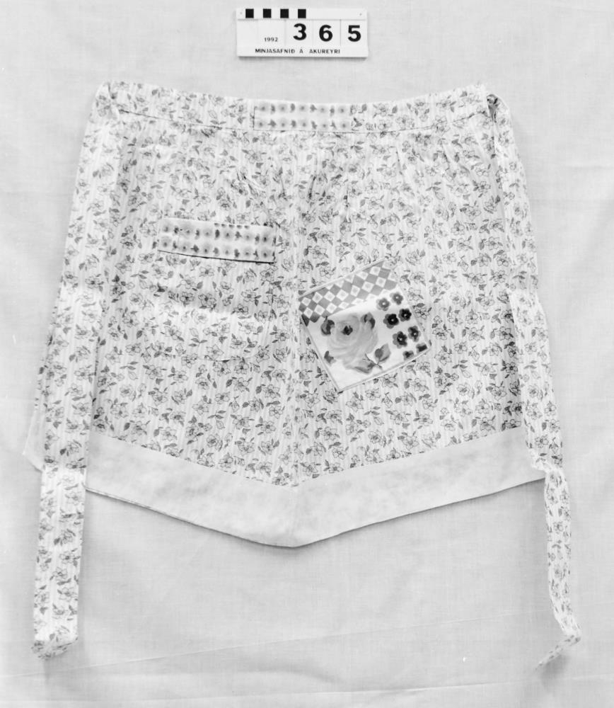 og hvítu í. Neðst er gulur bekkur. Einn vasi er á svuntunni og er