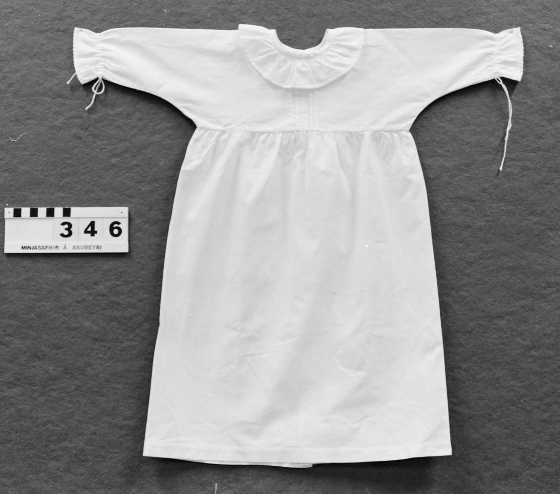 úr hvítu bómullarlérefti. Hann er síður og langerma og opinn í bakið. Efst