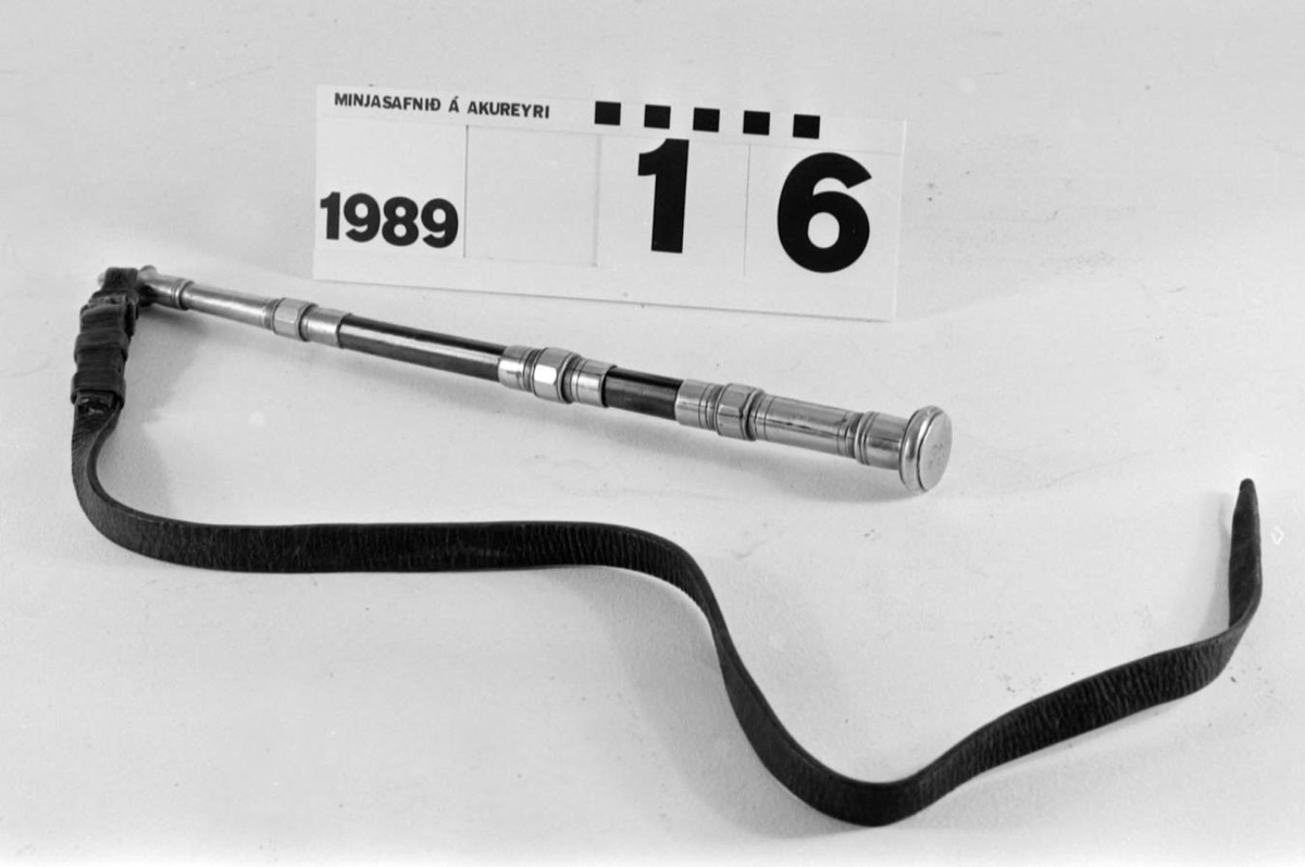 og silfurbúinn með leðuról í enda. Með fangamarkinu F.M. sem á líklega