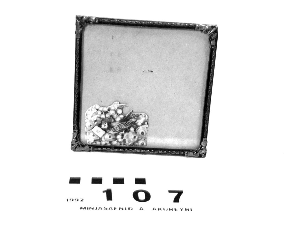 messing á hornum og málaður svartur ofan í skrautið. Innan í rammanum er