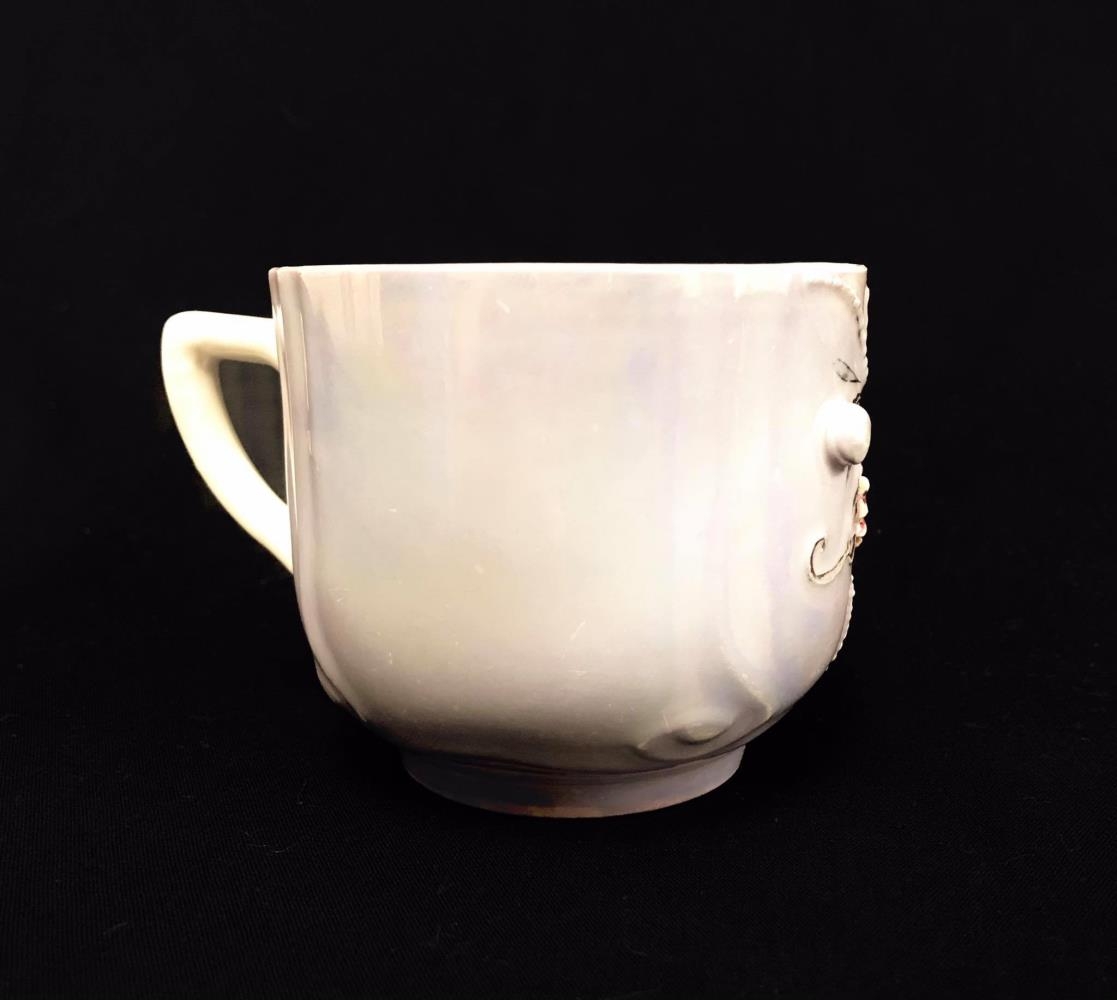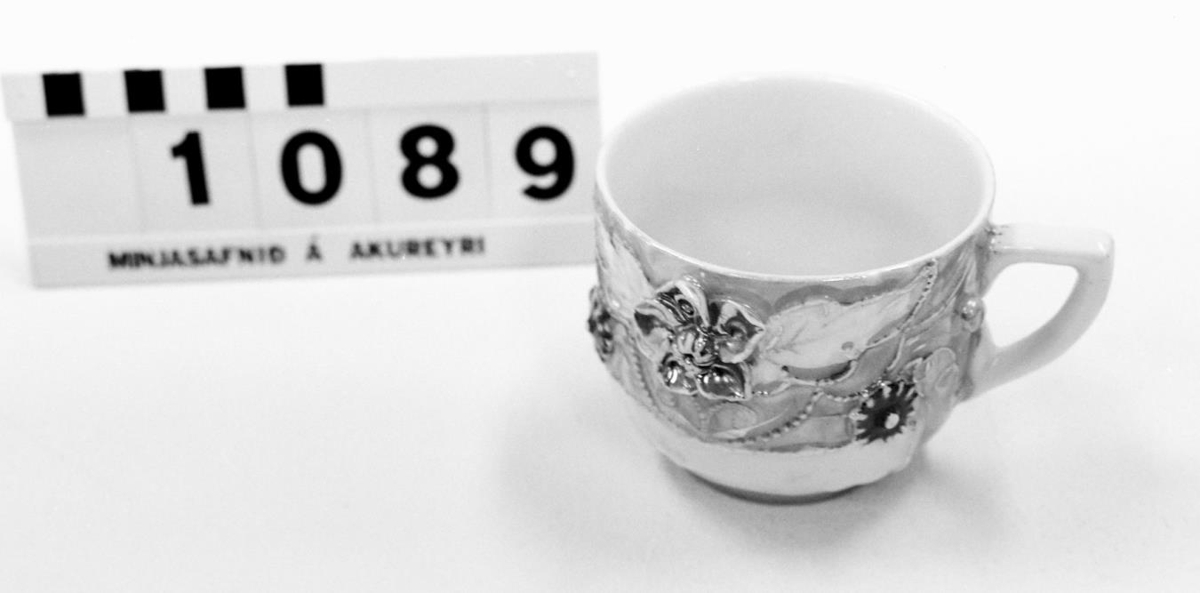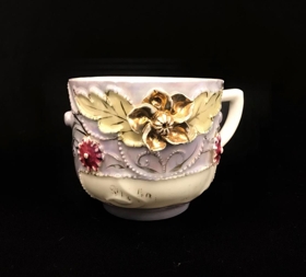 Stór bláleitur yfirbolli með upphleyptum gylltum og rauðum blómum. Áletrun með gylltu letri hefur verið neðarlega á bollanum, hún er nú svo máð að illa er hægt að lesa hvað þar stendur, það gæti þó hugsanlega verið: Til hamingju. Júní 20