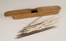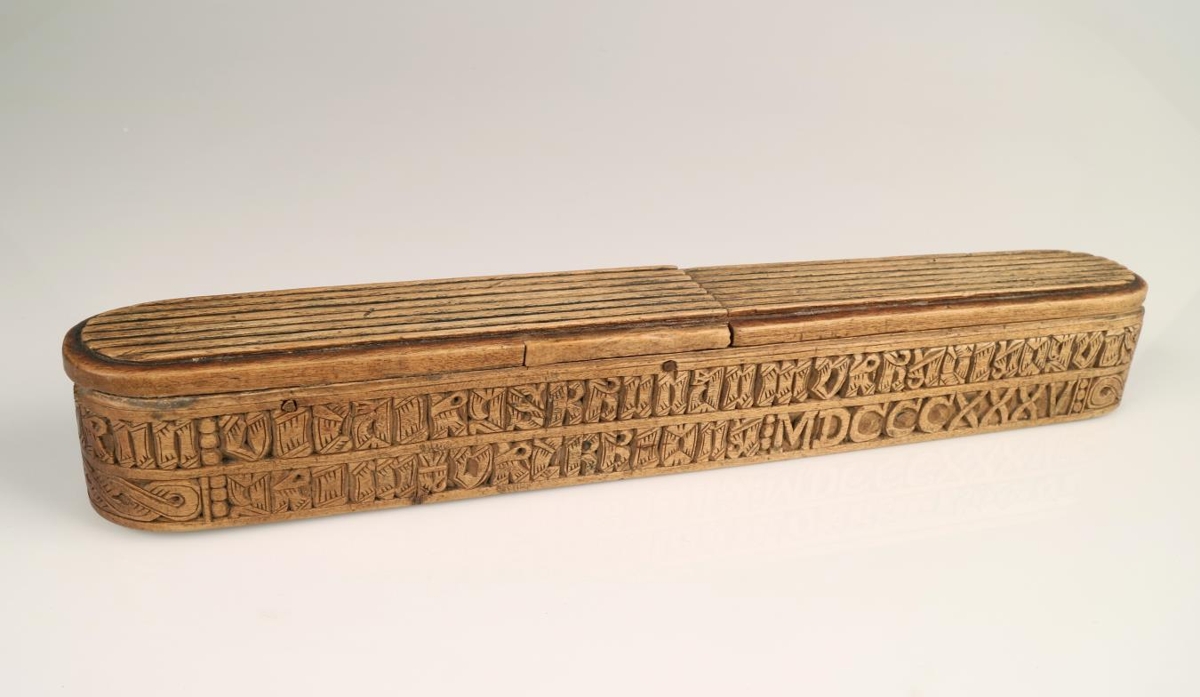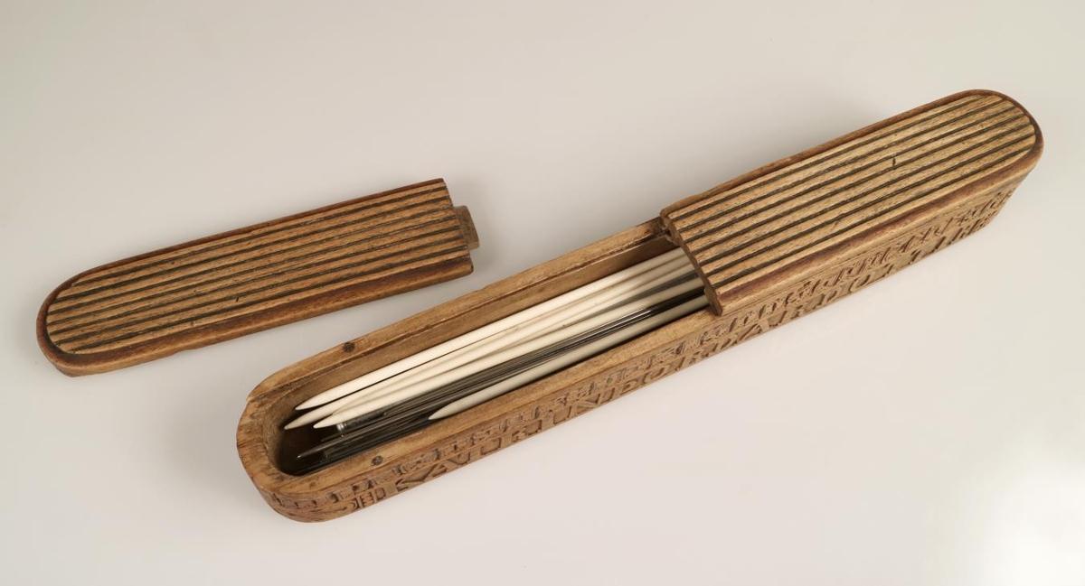 Prjónastokkur, fagurlega útskorinn höfðaletri allan hringinn. Endar stokksins eru bogadregnir. Stokkurinn er með renniloki, tvískiptu, og í það skornar 7 rákir til skrauts, eftir endilöngu loki. Stokkurinn er merktur eigandanum með latínuletri (hástöfum) á annarri hliðinni: KATRIN ÞORDARDOTTIR. Á hinni hliðinni er ártalið 1835, skorið með rómverskum tölum: MDCCCXXXV. Höfðaletursáletrunin er vísa: