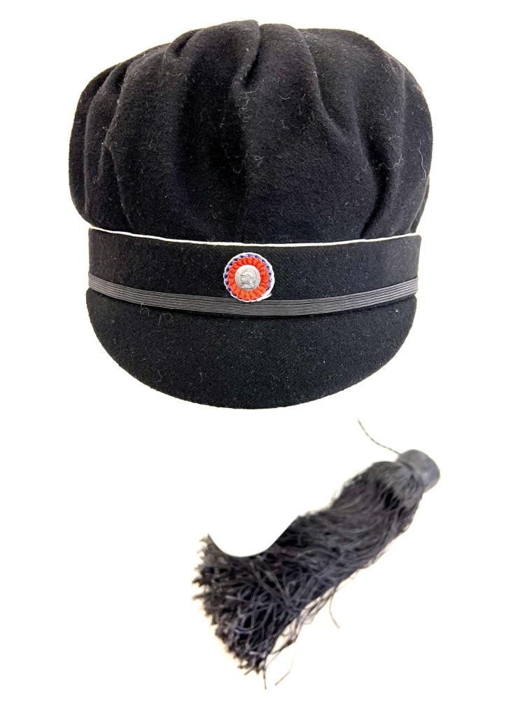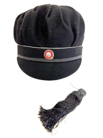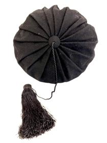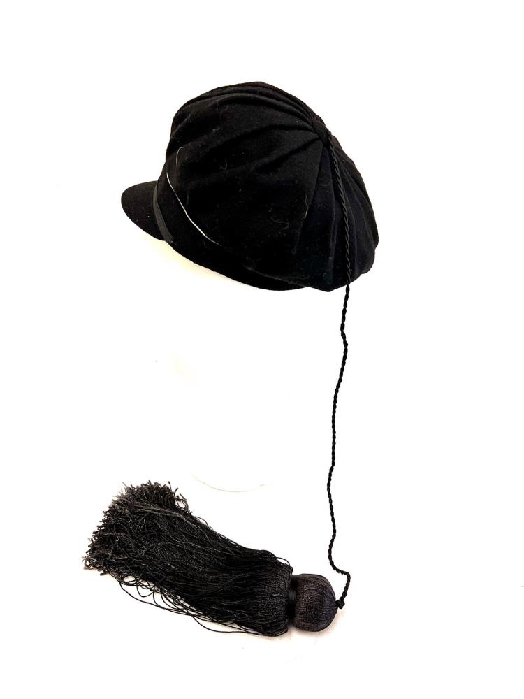 Útskriftarhúfa, svört húfa úr ullarefni með síðum dúsk. Frá Þrándheimi, Noregi.