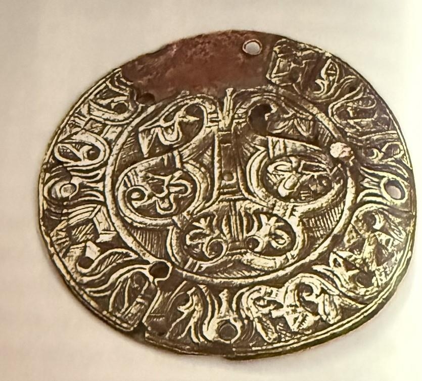 Reiðaskjöldur, grafinn, úr látúni og fóðraður með eir. Ofurlítið hefur skarðast úr skreytingu. Samhverft jurtaskreyti er í miðju, skrauthringur út við brún, líklega með eignarmerkingu því greina má bókstafi, stílfærða nokkuð, 17. eða 18 . öld. Skjöldurinn fannst fyrir löngu í fjörunni neðan við Lambeyri og loddi þá leður við bakhlið. Stefán er Rangæingur að ætt. Hann gaf og safn af eldspýtustokkum.