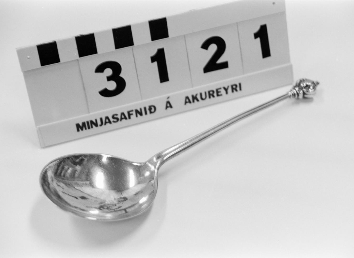 Silfurspónn. Skaftið mjög grannt, dálítið sívalt með krotuðum hnúð á enda. Blaðið er djúpt og dálítið kringlótt 5,4 x 5,8 sm. Neðan á blaðinu er ágrafinn rósahringur og innan í honum stafirnir H.E.T. og ártalið 1783. Spóninn átti séra Hallgrímur Einarsson Thorlacíus að Miklagarði.