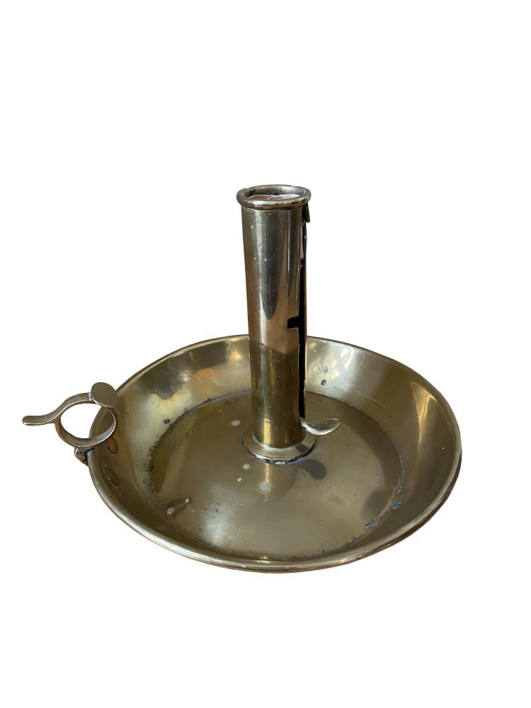 Kertastjaki á skál, úr messing. Hnúðar á 3-skiptum stilli (brotinn), gert við. 19 sm í þvermál, 14,5 á hæð, 440 g. Á botni er smíðamerki og ártal 1795.