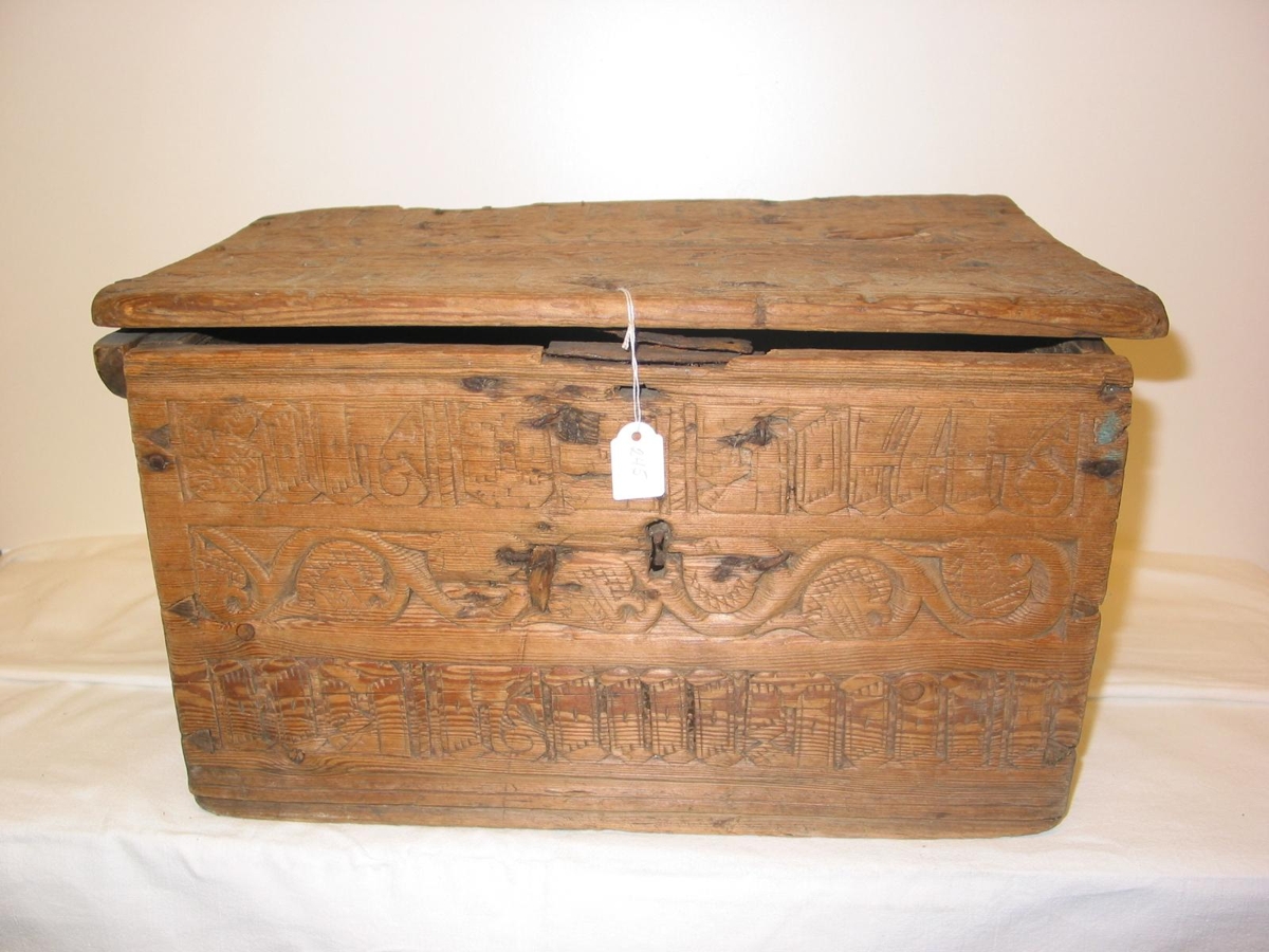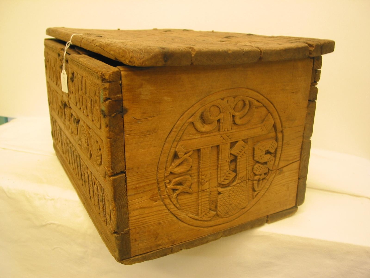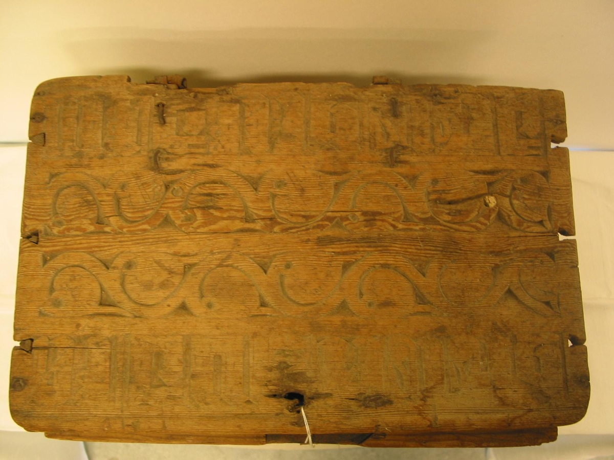 Kistill útskorinn, með höfðaletri og skreytingum, Lokið er laust öðru megin. Með handraða og skrá