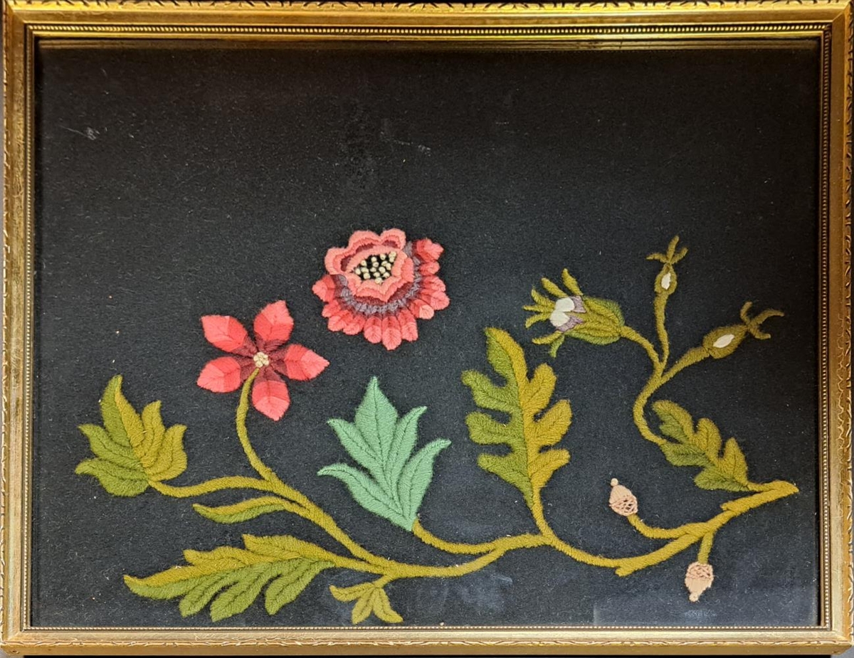 Útsaumað blómamynstur, kúnstbróderi með varplegg, úr lituðu ullarbandi á svart ullarefni.