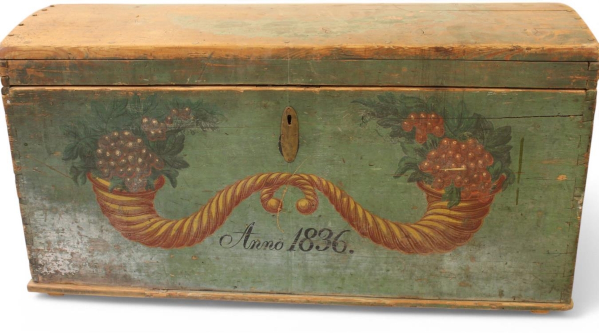 Kista, rósamáluð. Málning máð á loki. Ámálað ártal 1836.
