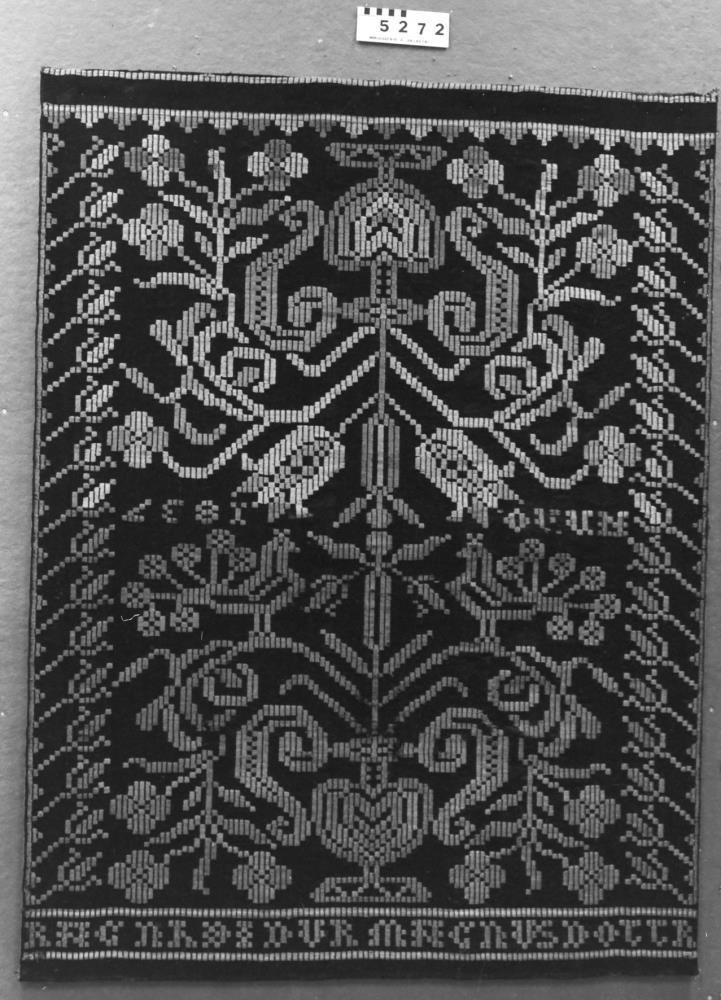 Glitofið söðuláklæði á svörtum grunni. Munstrið er blómalíki og hlutar í tveim rauðum litum og tveim grænum litum. Neðst á áklæðinu stendur "RAGNHEIÐUR MAGNÚSDÓTTIR" fyrir miðju á hvolfi stendur "ANNO 1837".