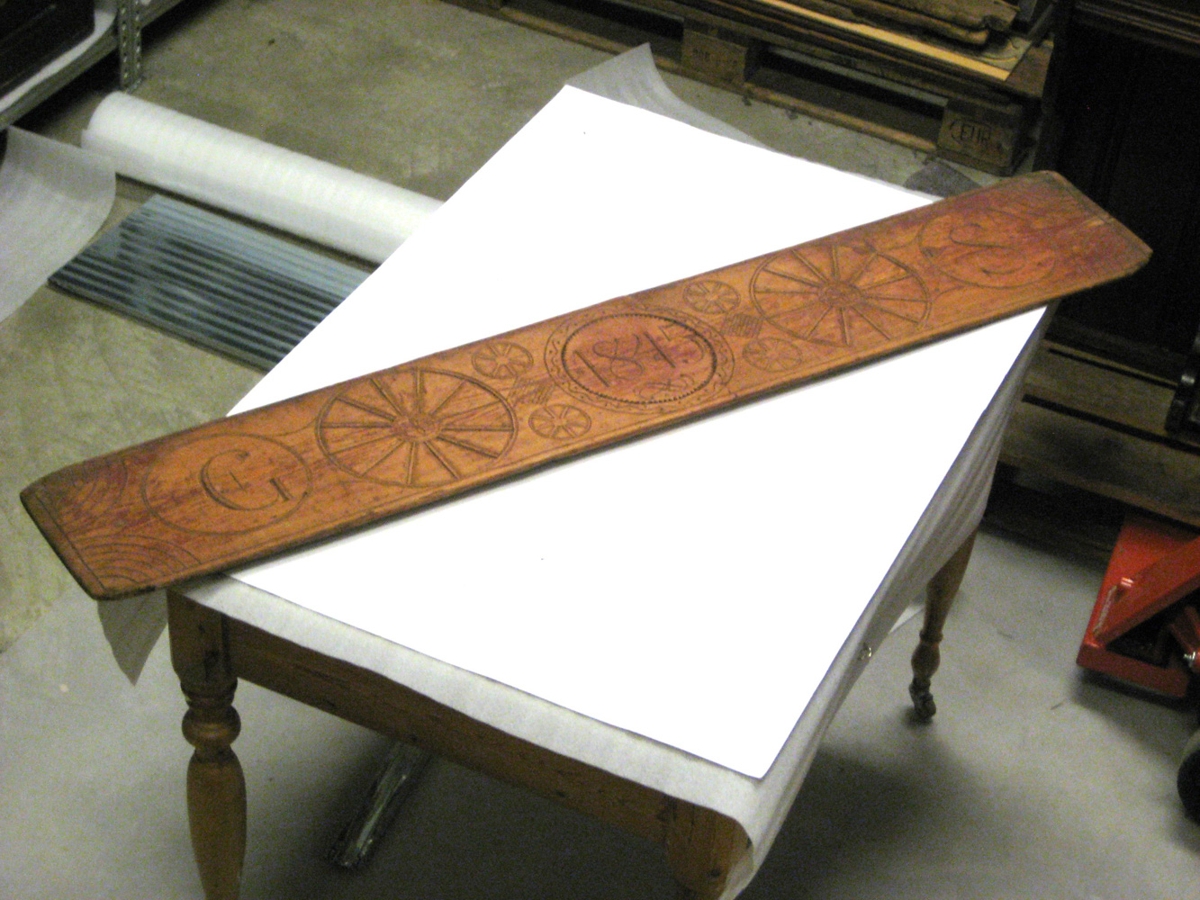 Rúmfjöl með ártalinu 1845 og bókstöfunum: G.S. Stafirnir eru sitt til hvorrar hliðar en ártalið í miðju. „Kerruhjól“ útskorin til beggja enda. Þetta er rúmfjöl séra Gísla Ísleifssonar, síðast prests að Kálfholti og konu hans Sigríðar Guðmundsdóttur. Þau reistu bú að Selalæk árið 1838 en fluttust að Kálfholti 1841, þar dó séra Gísli árið 1851. Að þeim hjónum látnum fékk dóttir þeirra fjölina, það var Sigríður kona séra Stefáns Stephensen á Mosfelli. Eftir hana fékk dóttir hennar Þórunn í Skipholti fjölina, þá dóttir hennar Sigrún er enn býr í Skipholti. Fjölin brotnaði í tvennt fyrir um 20 árum, var á send til viðgerðar að Villingaholti, en viðgerðin drógst lengi. Fann Skúli Helgason hana óviðgerða á húslofti bak við sperru og með leyfi Sigrúnar í Skipholti fékkst hún í safnið og gerði Skúli við hana.