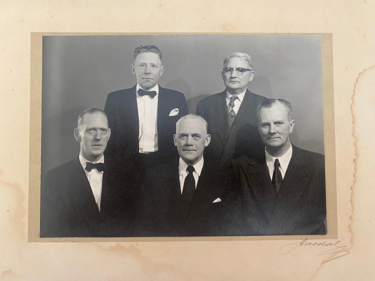 Ljósmynd af fimm karlmönnum: Ingólfur Guðmundsson, Þorlákur Ottesen, Kristján Vigfússon, Keli í Krossamýrinni og óþekktur. Myndin hefur verið tekin úr ramma. Myndin er merkt Kaldal.