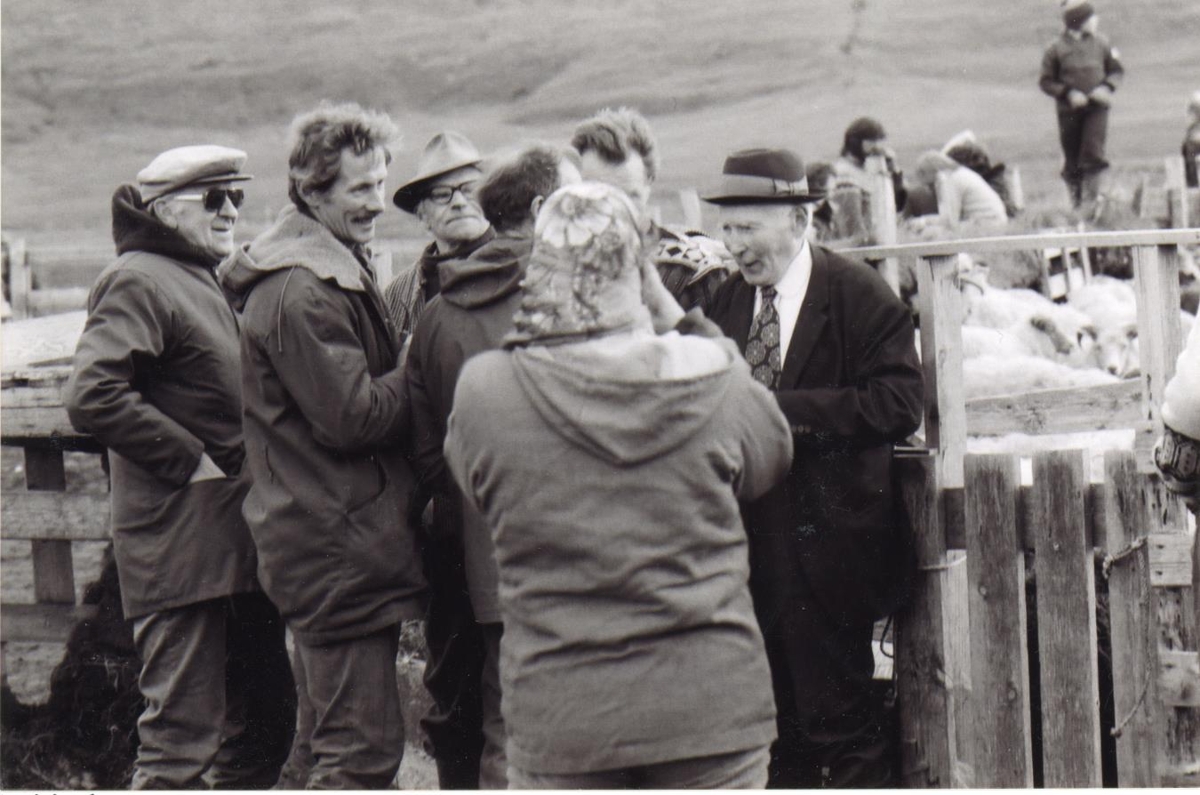 Frá vinstri. Jón Jósepsson á Sámsstöðum, Ólafur Pálmason í Engihlíð, Eyjólfur Jónasson í Sólheimum, Ingvi Eyjólfsson í Sólheimum, Kristín Kristjánsdóttir á Lambastöðum (baksvipur), Hjalti Þórðarson á Hróðnýjarstöðum og Árni Tómasson frá Lambastöðum.