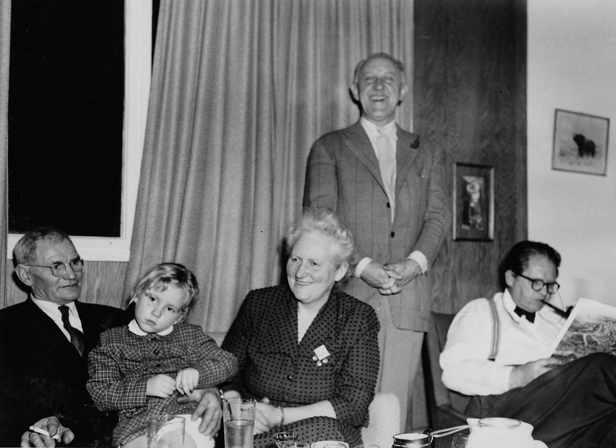 Sveinn Guðmundsson faðir Auðar, Sigríður Halldórsdóttir, Halldóra Kristín Jónsdóttir og Halldór Laxness í stofunni á Gljúfrasteini. Við ljósmyndina í albúminu hefur Auður skrifað: Afmæli pabba, mánuði áður en hann dó.