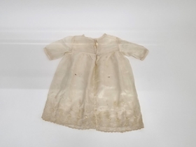 Lítill kjóll, á ungabarn, ekki vitað um fyrri notkun. Sennilega skírnarkjóll.