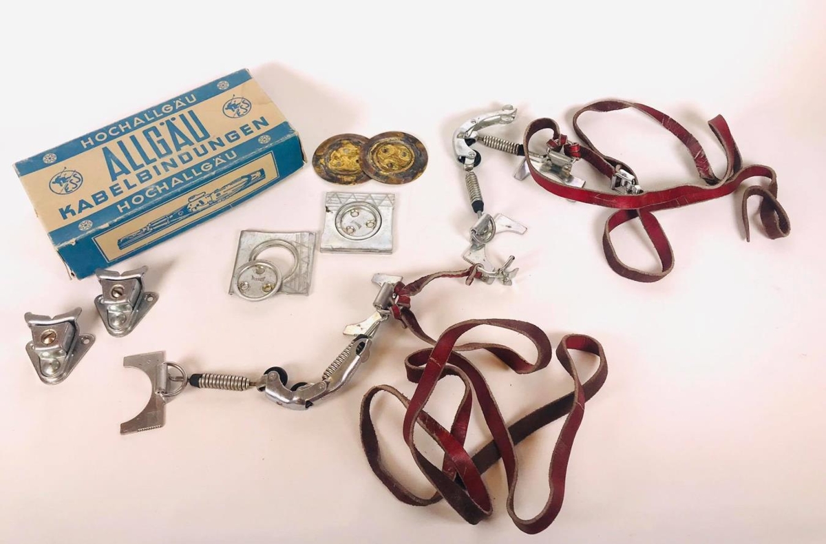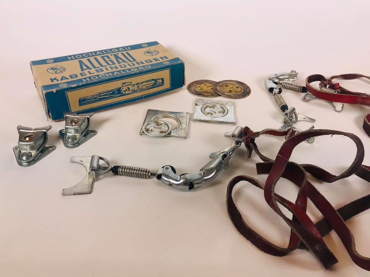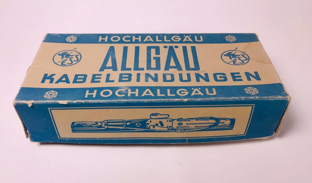 Skíðabindingar í upprunalegum umbúðum. Bindingar og ýmsar festingar fylgja með. Kassinn er grár og blár með áletrun : Hochallgau. Allgau. Kabelbindungen.ESS. Myndskreyttur með skuggamyndum af fólki á skíðum og skíðabindingum.