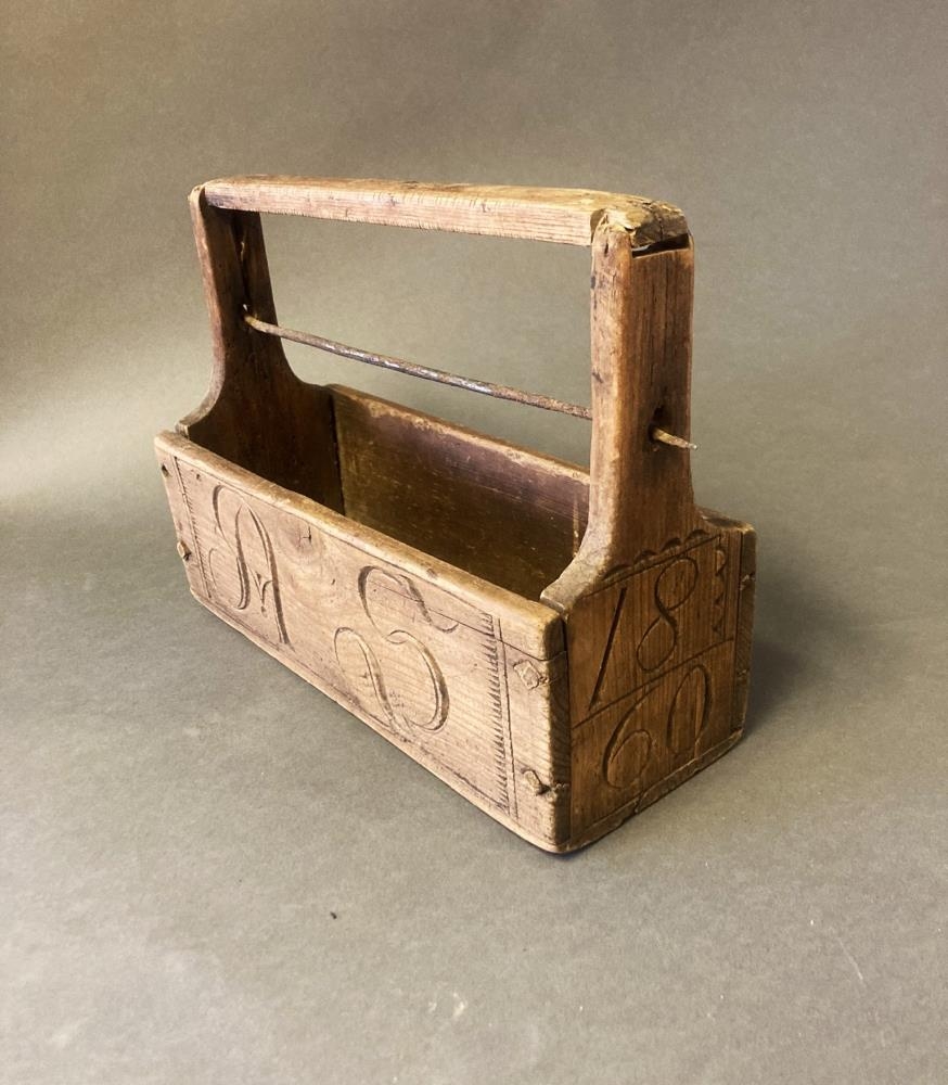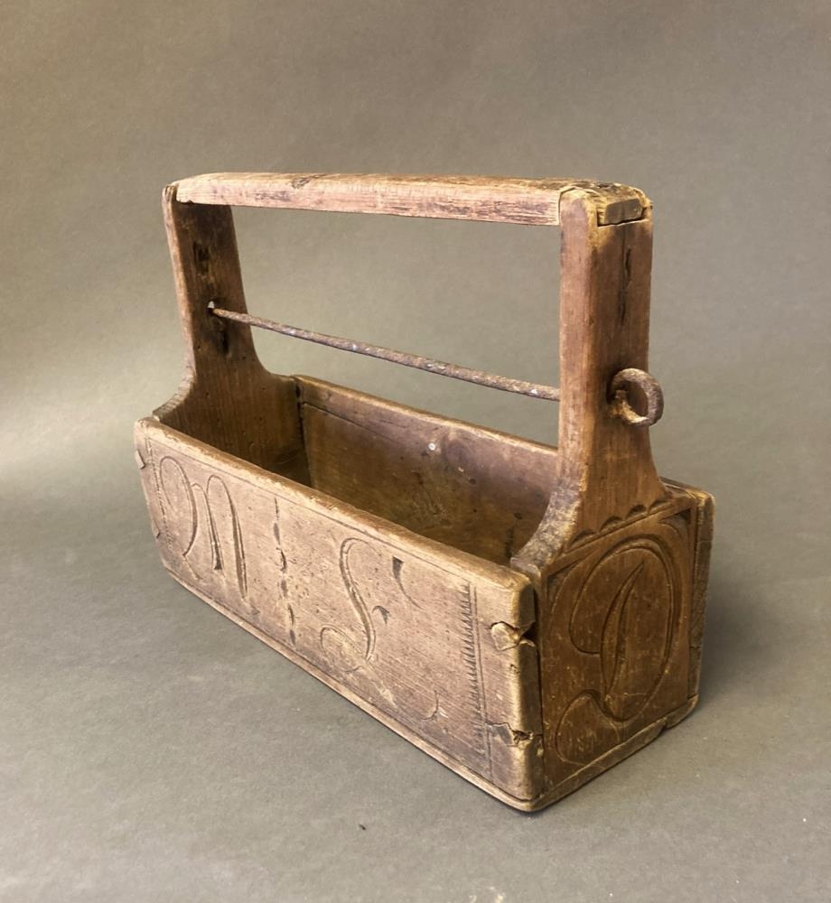 Snældustokkur með ártali 1861 og fangamarki M...., úr eigu Margrétar á Melhóli í Meðallandi, móður Jóhannesar Árnasonar í Gröf og móður hennar.
