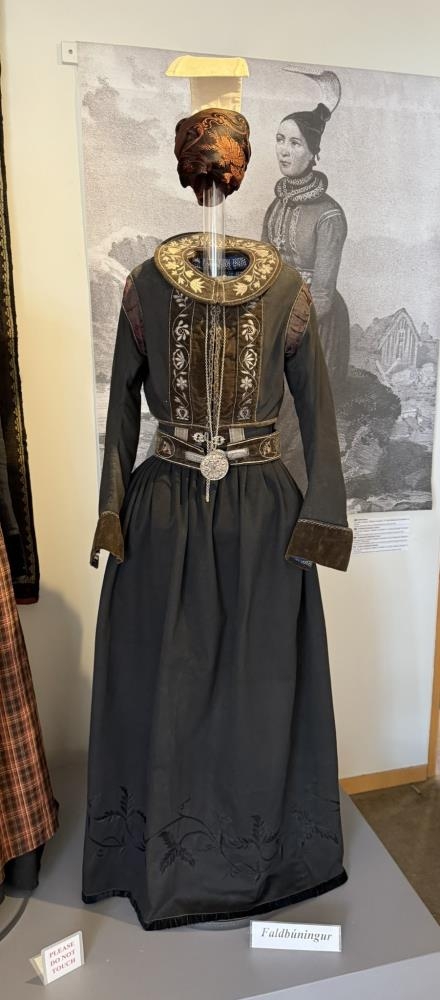Skauttreyja, upphlutur og kragi frá skautbúningi frú Guðlaugar Halldórsdóttur í Suður-Vík. Treyjan og kraginn baldíruð. Silfrið hefur verið tekið af upphlutnum. Safnvörður hefur látið steypa á hann millur í gömlum stíl.