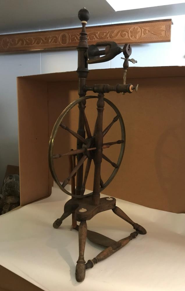 Rokkur Guðbjargar Sigurðardóttur frá Barkarstöðum í Fljótshlíð, húsfreyju í Butru, renndur úr mahogny af Jóni Erlendssyni á Arngeirsstöðum um 1880, vandaður gripur. Hjólgjörð er út látúni. Hnokkatré, snældur og hlaupastelpu vantar, brotið er ofan af brúðu.
