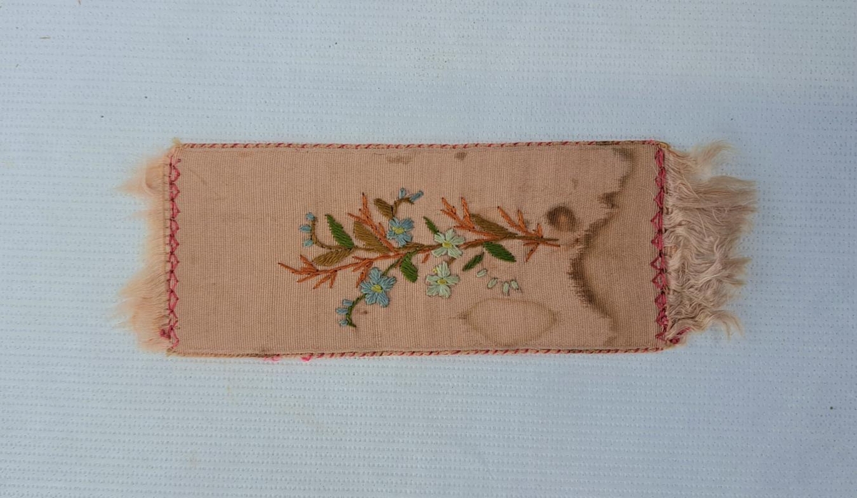 Bókamerki saumað af Regínu Benediktsdóttir (1887-1929) sem hún gaf mömmu sinni Ástu Þórarinsdóttur (1859-1929) prestfrú á Grenjaðarstað. Muninn gaf Vilborg Sveinbjarnardóttir. Vilborg er dóttir Sveinbjörns Benediktssonar prestssonar á Grenjaðarstað. Vilborg býr í Victoria-eyju fyrir uta Vancouver í Kanada.