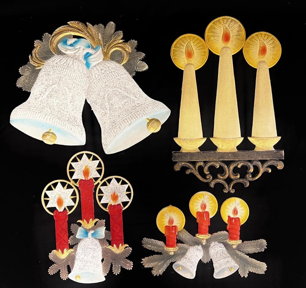 Pappaspjöld, skrautspjöld í laginu eins og kertaskreytingar og bjöllur. Upphleyptur pappi og glimmer.