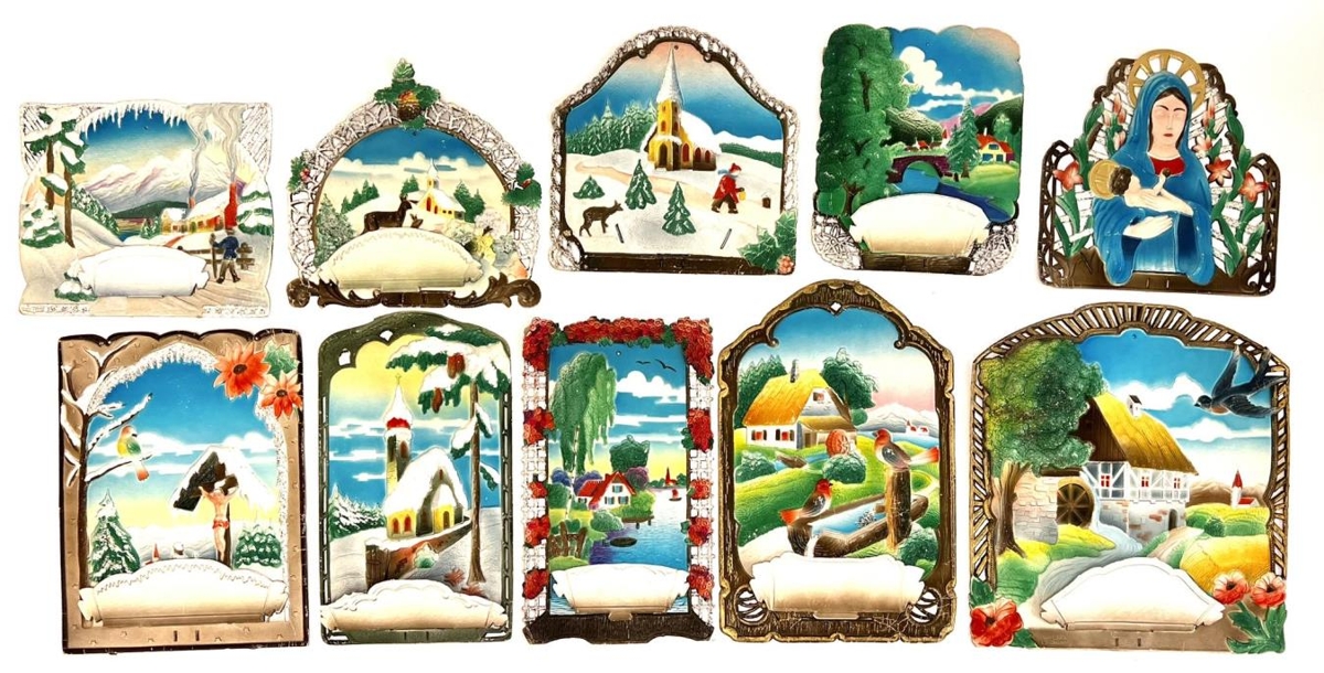 Pappaspjöld með upphleyptum myndum og glimmeri, göt á spjöldunum sem í er tyllt litlum spjöldum sem eru brýr og standa örlítið út frá myndaspjöldunum. Myndefnið er landslag, evrópskt sveitalandslag bæði að sumri og vetri. Á sumum spjöldunum stendur Wester Germany. Ár liðast framhjá sveitaheimilum að sumri, snæviþakktar kirkjur, Jesú á krossinum í snjóþungum skógi og María mey með jesúbarnið.