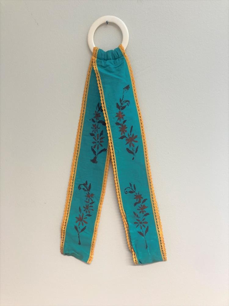 Dökkgrænt léreft með ámáluðu rauðbrúnu blómamynstri. Brydduð með gulri blúndu. Fest saman með hvítum plasthring.