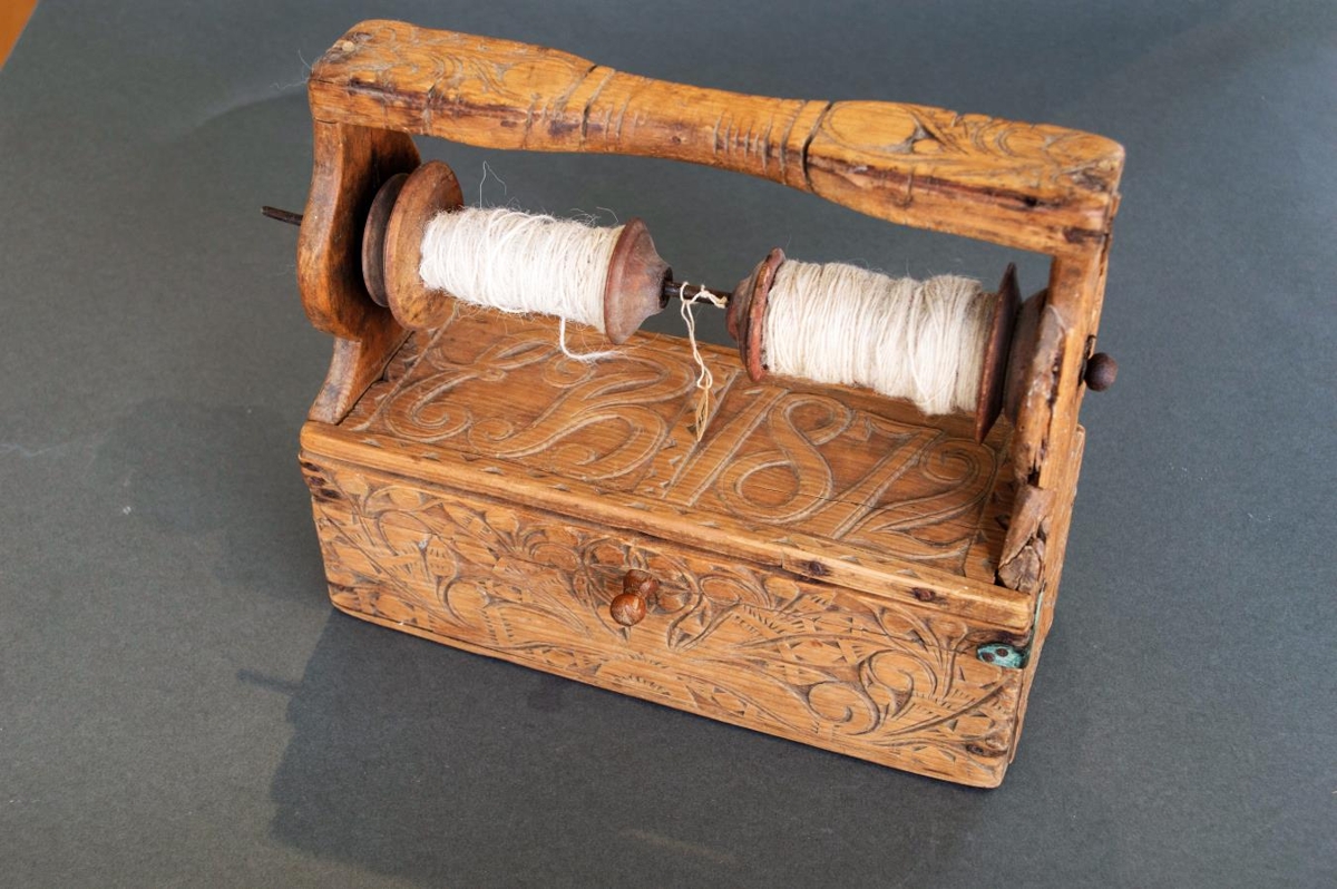 Snældustokkur, smíðaður og útskorinn af Samúel Jónssyni trésmíðameistara frá Hunkubökkum á Síðu (1864-1937) um 1885 handa unnustu hans, Margréti Jónsdóttur frá Leirum undir Eyjafjöllum. Margrét gaf stokkinn Jóhönnu Þorsteinsdóttur frá Fíflholti í Landeyjum, móður gefanda.