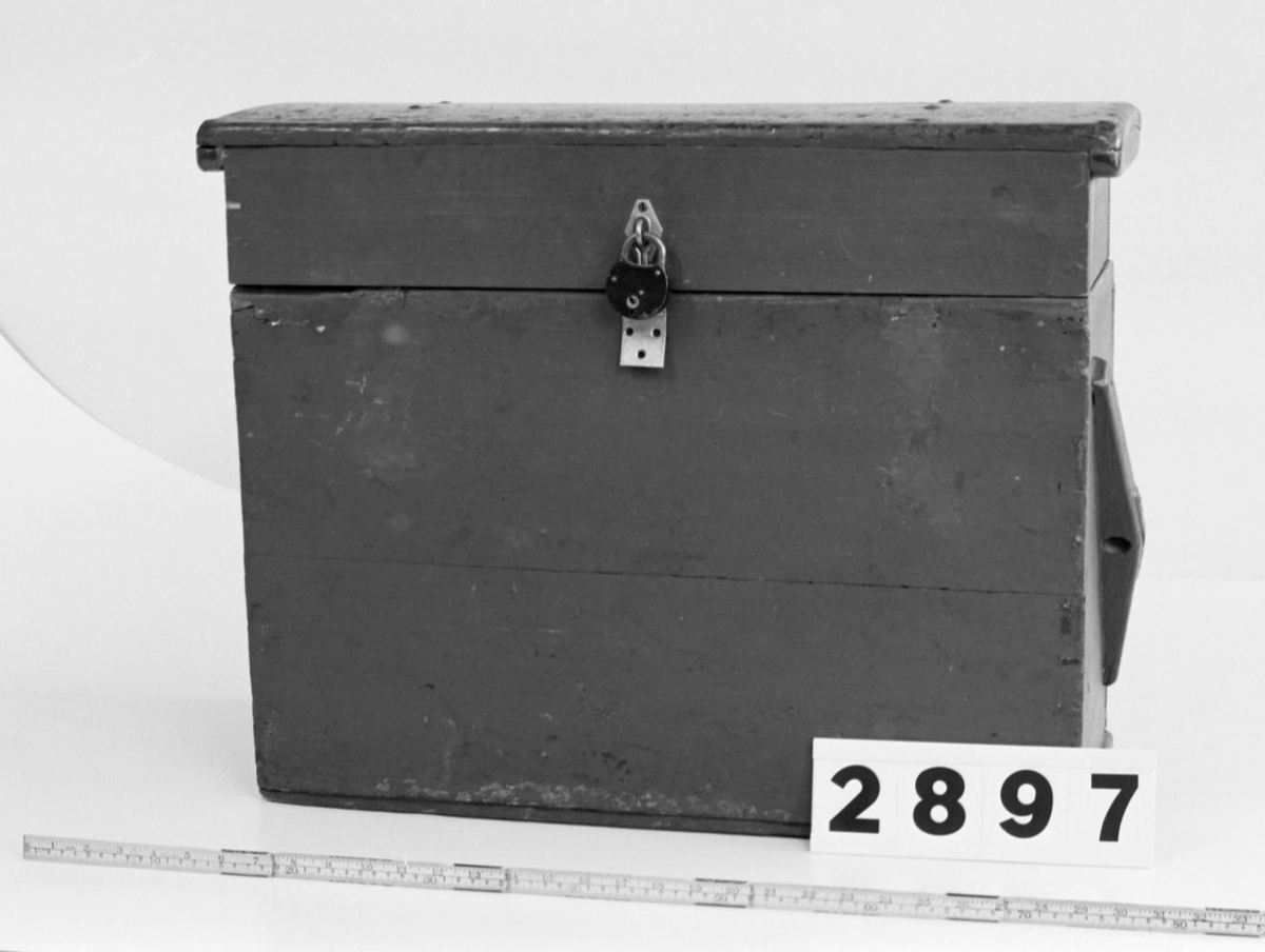 úr furu með lítið eitt kúptu loki og skáokum með gati á göflum. Geirneglt
