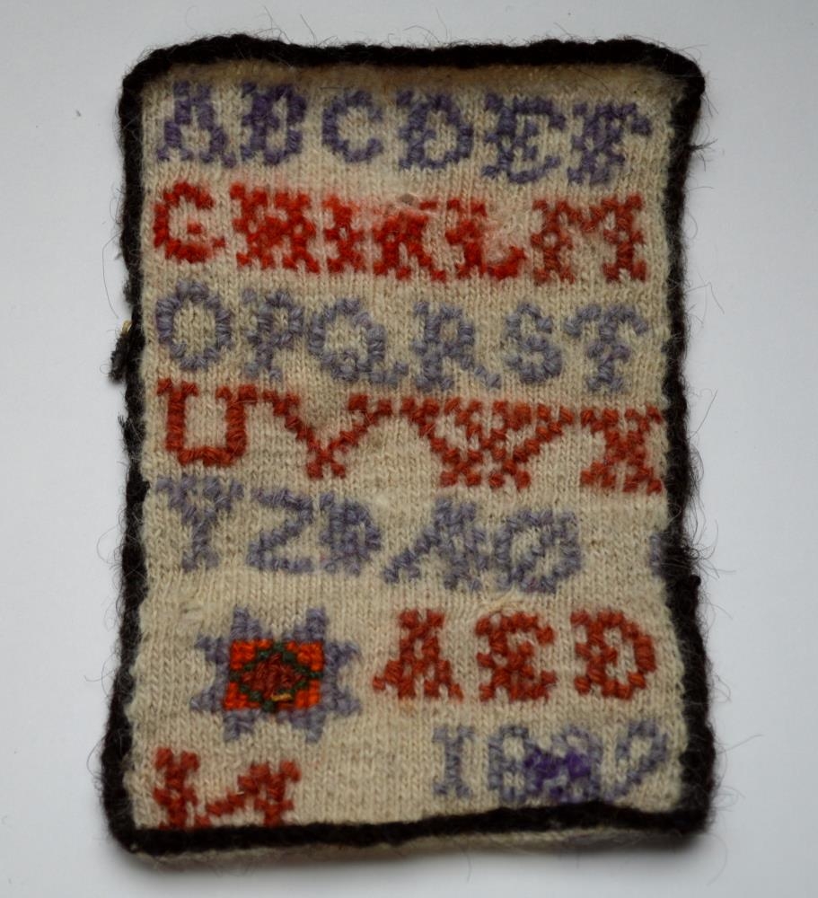 latínustafrófi og áttblaða rós. Ártal 1886 og fangamark, AED.=Ásbjörg Einarsdóttir.