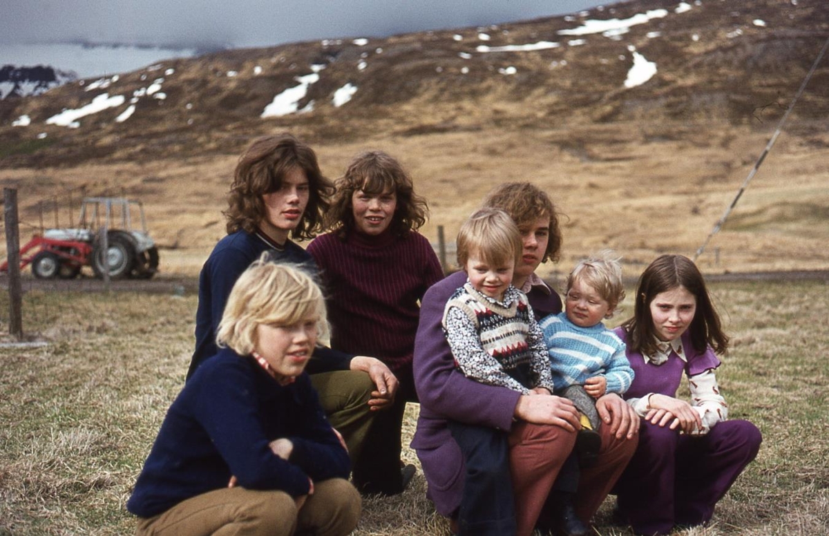 Frá vinstri. Jakob Sigurðsson frá Miklagarði, Úlfar, Þröstur, Bjarki og Sigurður Reynissynir á Kjarlaksvöllum, óþekkt barn og Hugrún Reynisdóttir á Kjarlaksvöllum.