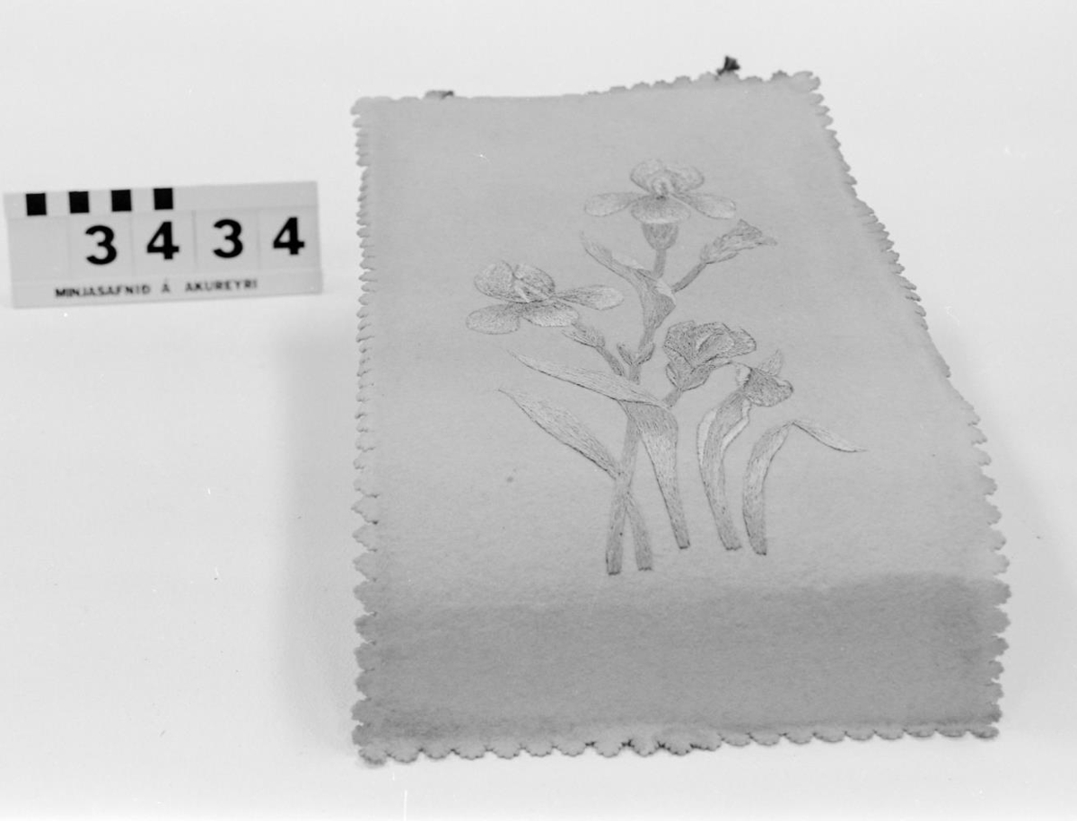 úr mógráu efni, saumuð með blómstursaum og skornum laufum allt í kring.