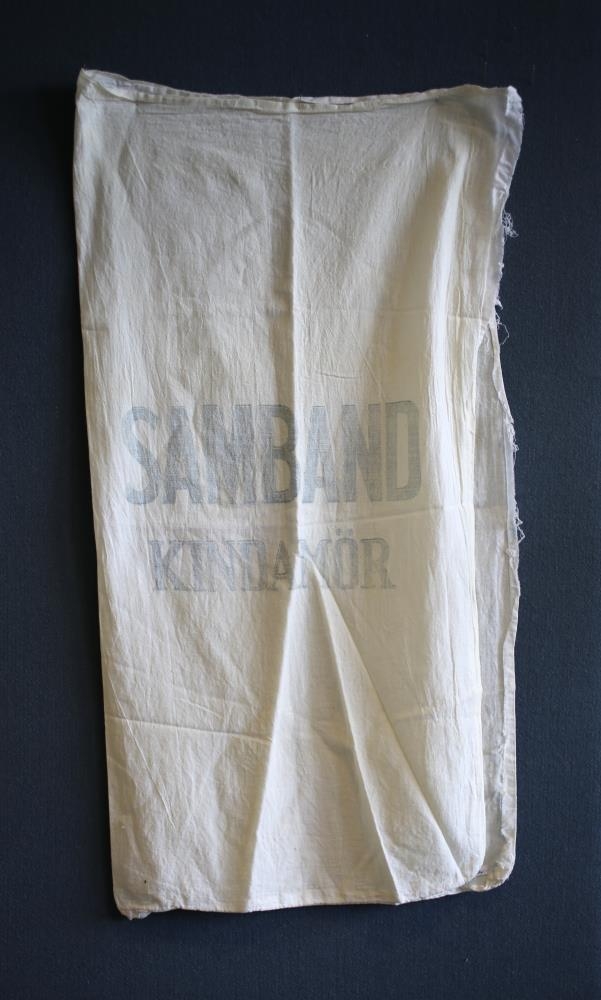 Ónotaður hvítur taupoki sem á eftir að sauma saman. Á honum stendur "Sambandsmör- kindamör" með bláum stöfum.