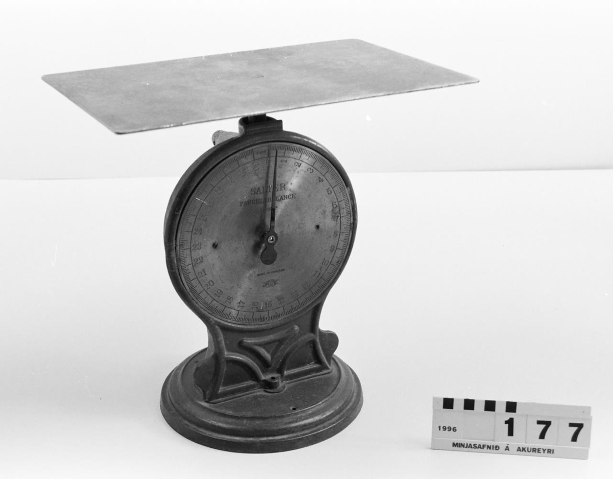 0-30 kíló. Á skífunni stendur "SALTER PARCEL BALANCE No. 50P, MADE