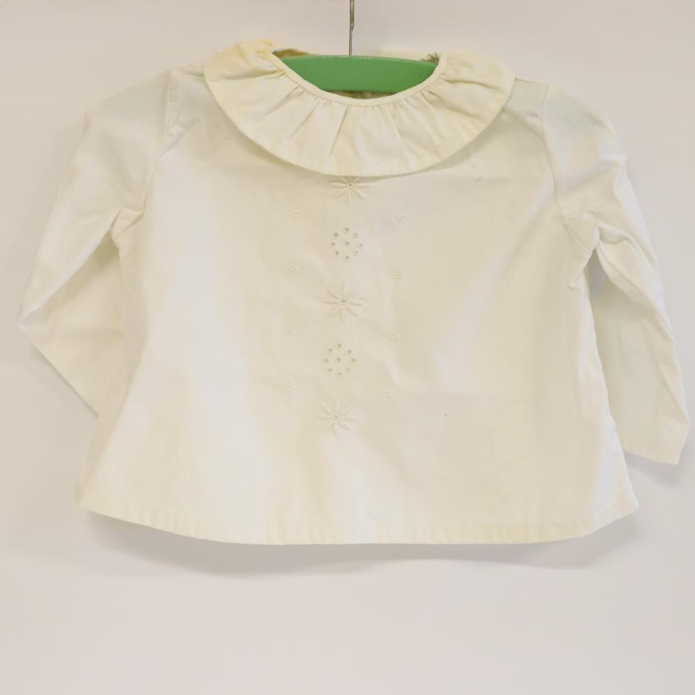 Ungbarnaskyrta. Guðrún Bjrnadóttir ættuð frá Kothúsum i Garði saumaði skyrtuna í saumavél og í höndum, útsaumur að framan og tölur að aftan.