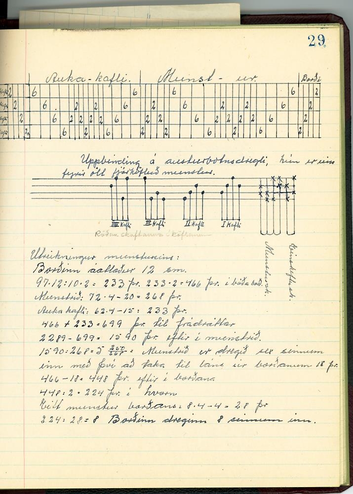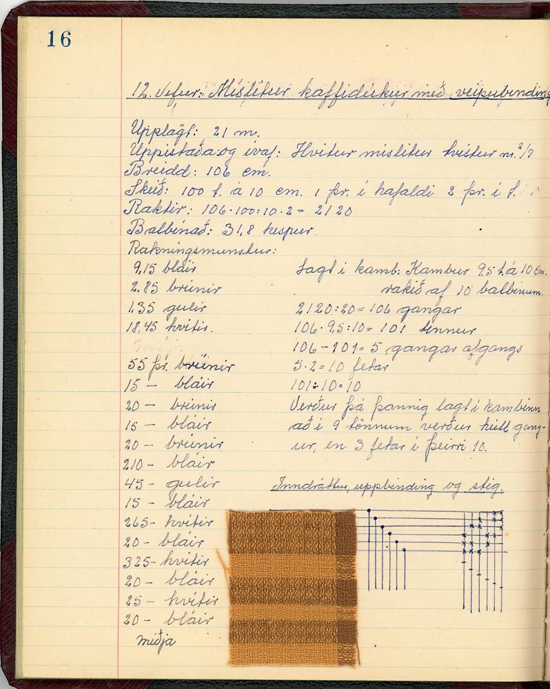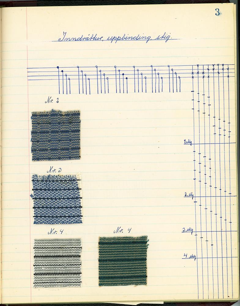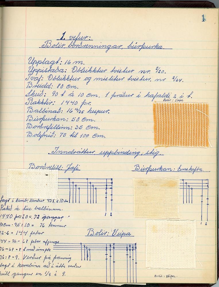 Þar má finna tilsögn er kemur að vefnaði, bæði til að setja upp í vefstól, munsturgerð, litun o.fl. Prufur hafa verfið festar á sumar blaðsíður til nánari útskýringar.
